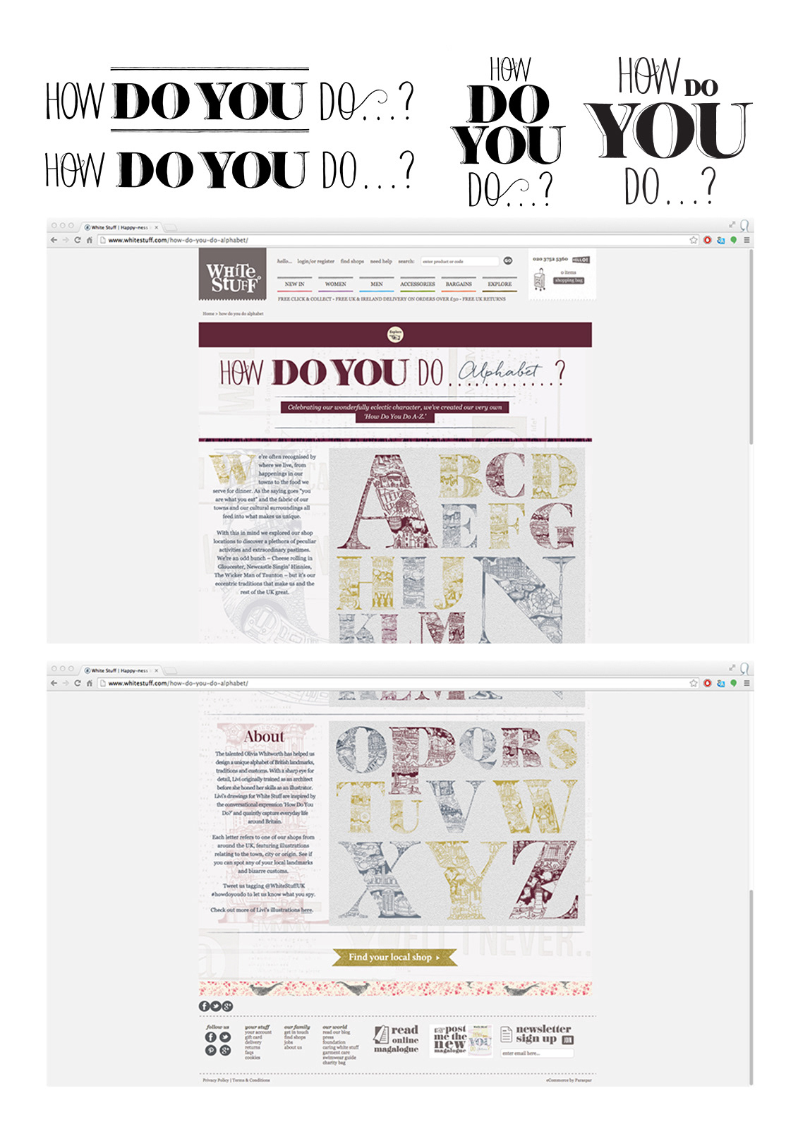 I was lucky enough to be asked this summer to prepare an illustrated alphabet for White Stuff, as part of their Autumn campaign 'How Do You Do?' - looking at everything British. The alphabet specifically picks up on place names where they have a store location beginning with that letter. British places, landmarks, food, traditions and people - each letter contains a little piece of the UK.