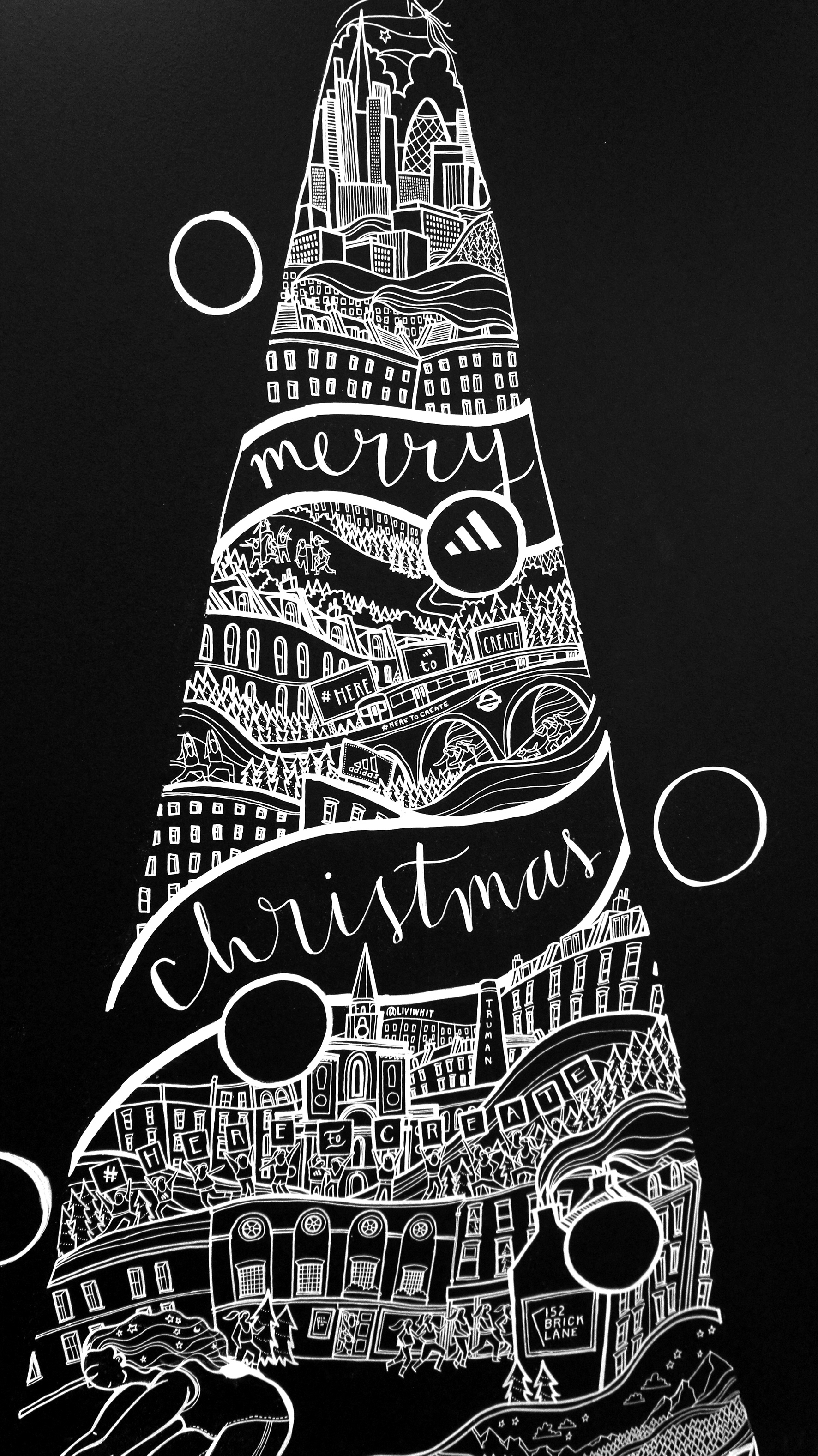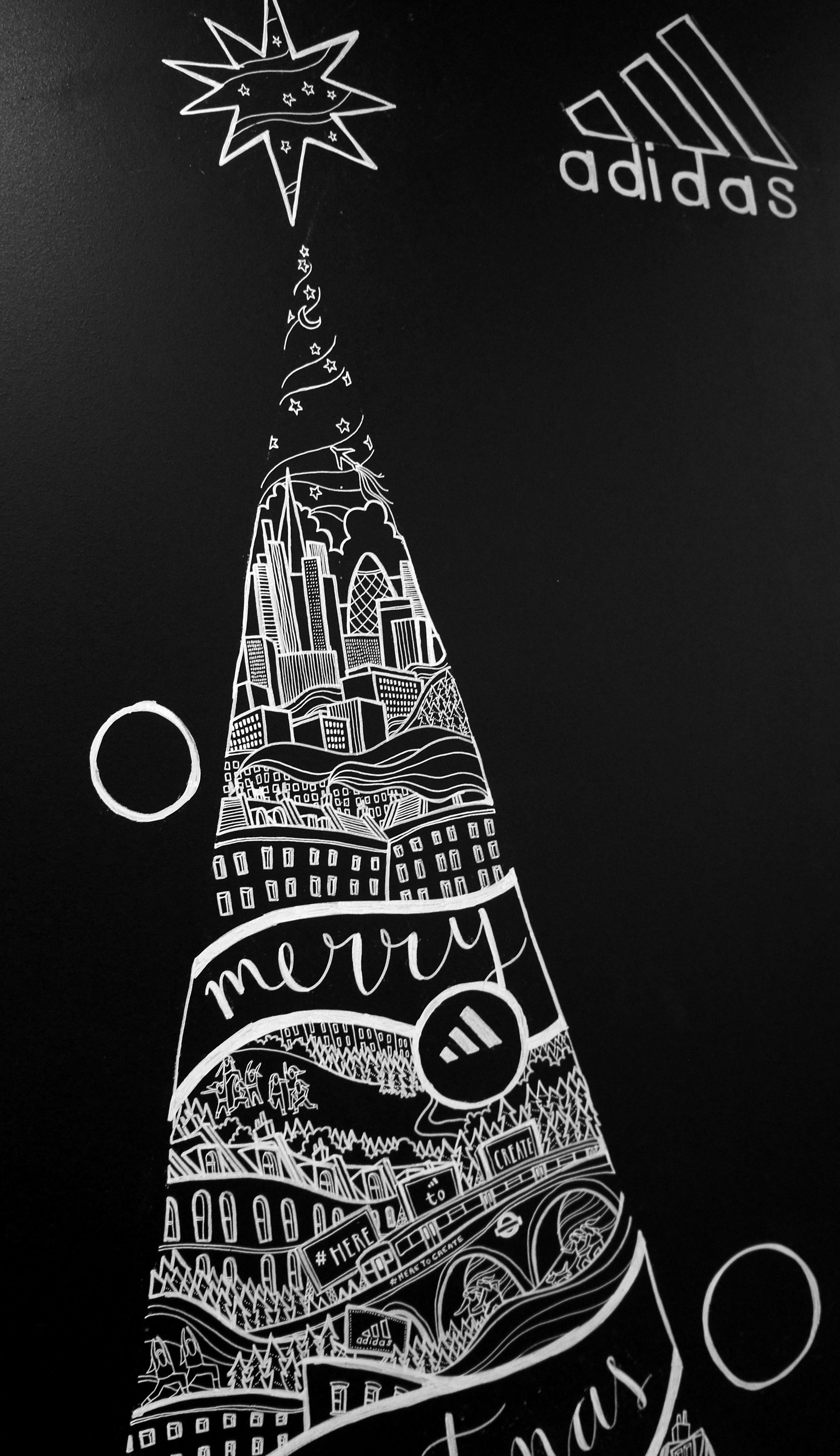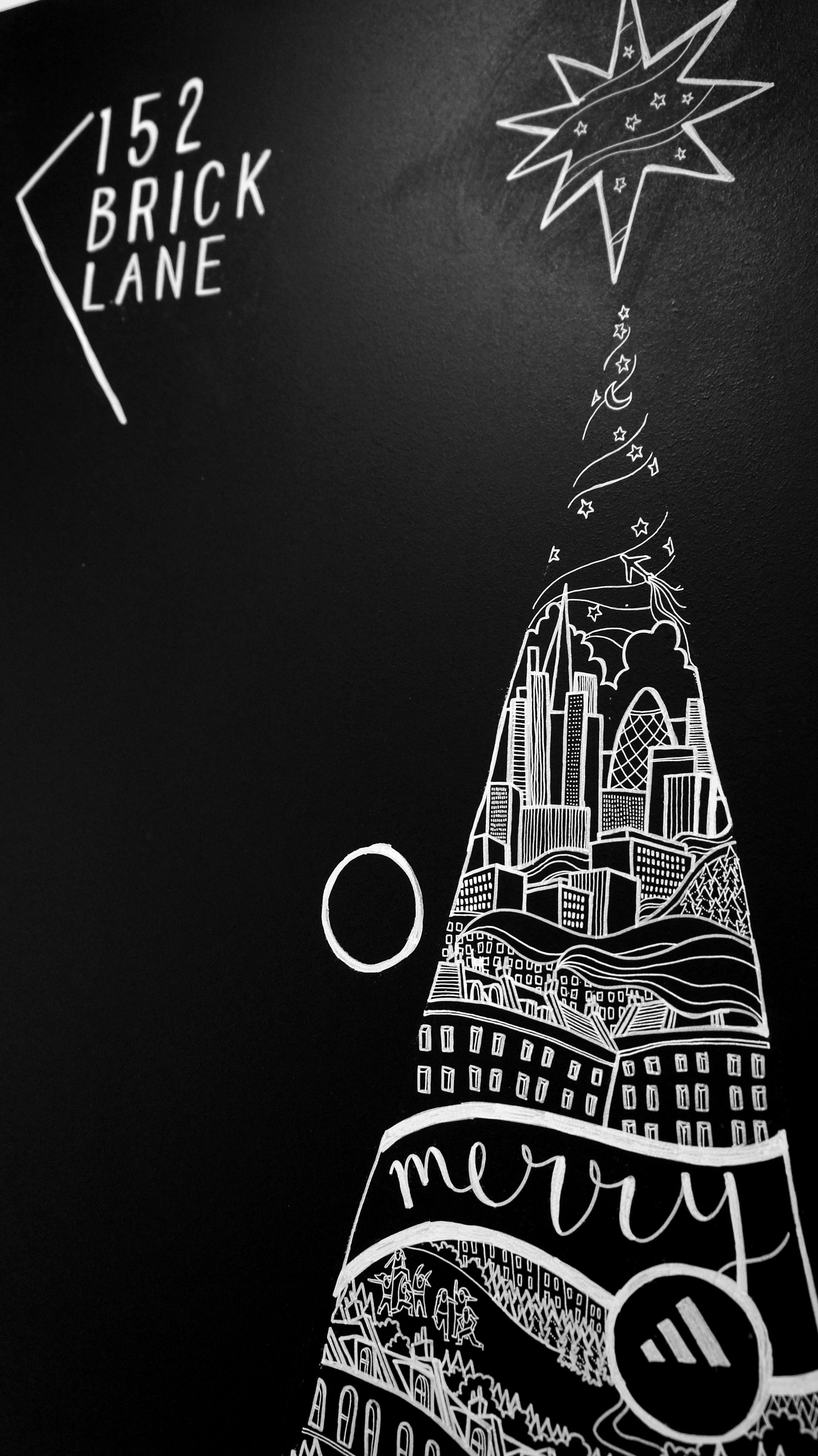 I was asked by the Adidas Fitness Studio at 152 Brick Lane to do a Christmas mural on a large blackboard. I spent the day drawing and managed to make a quick time lapse of its progress throughout the day.