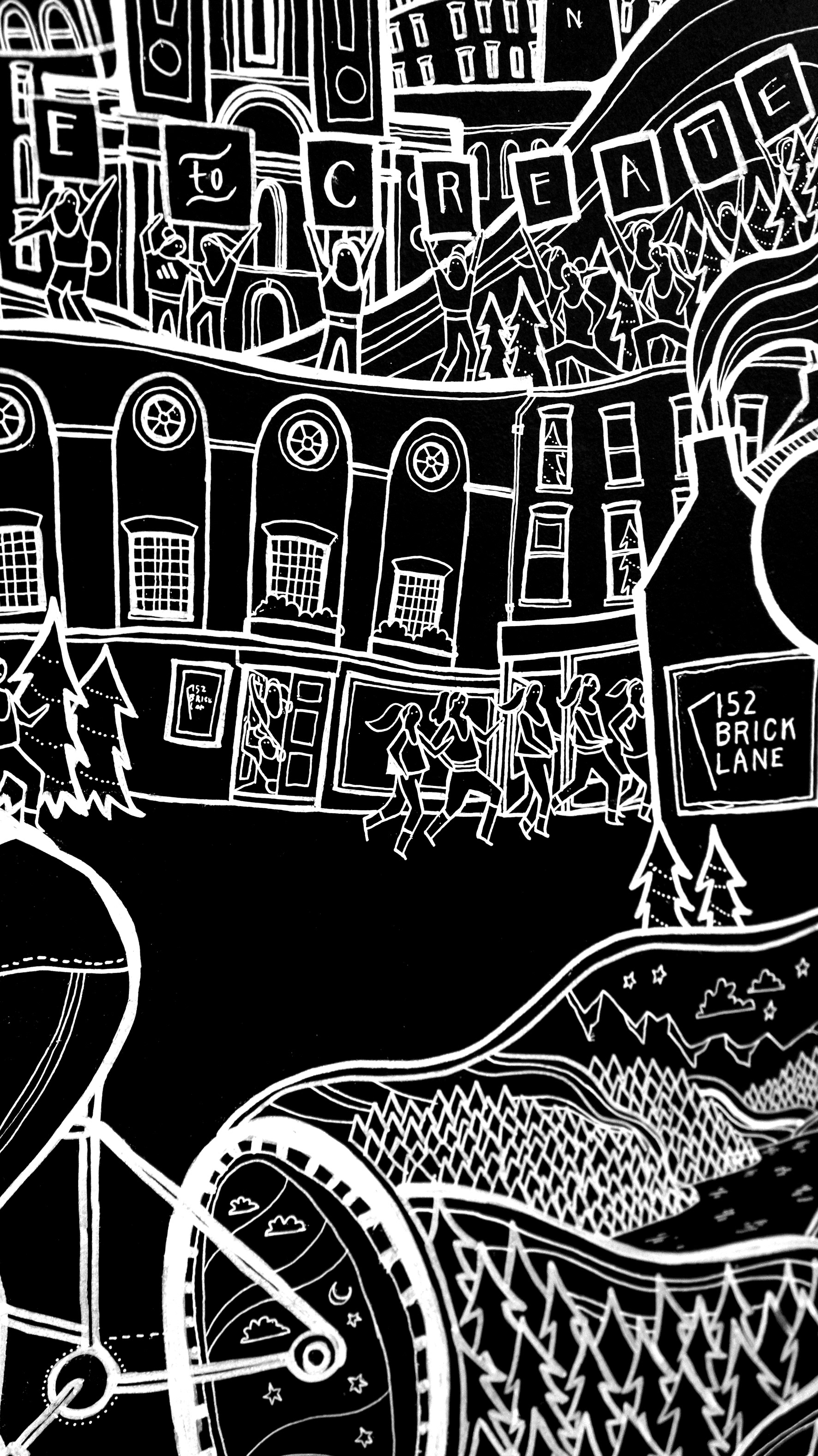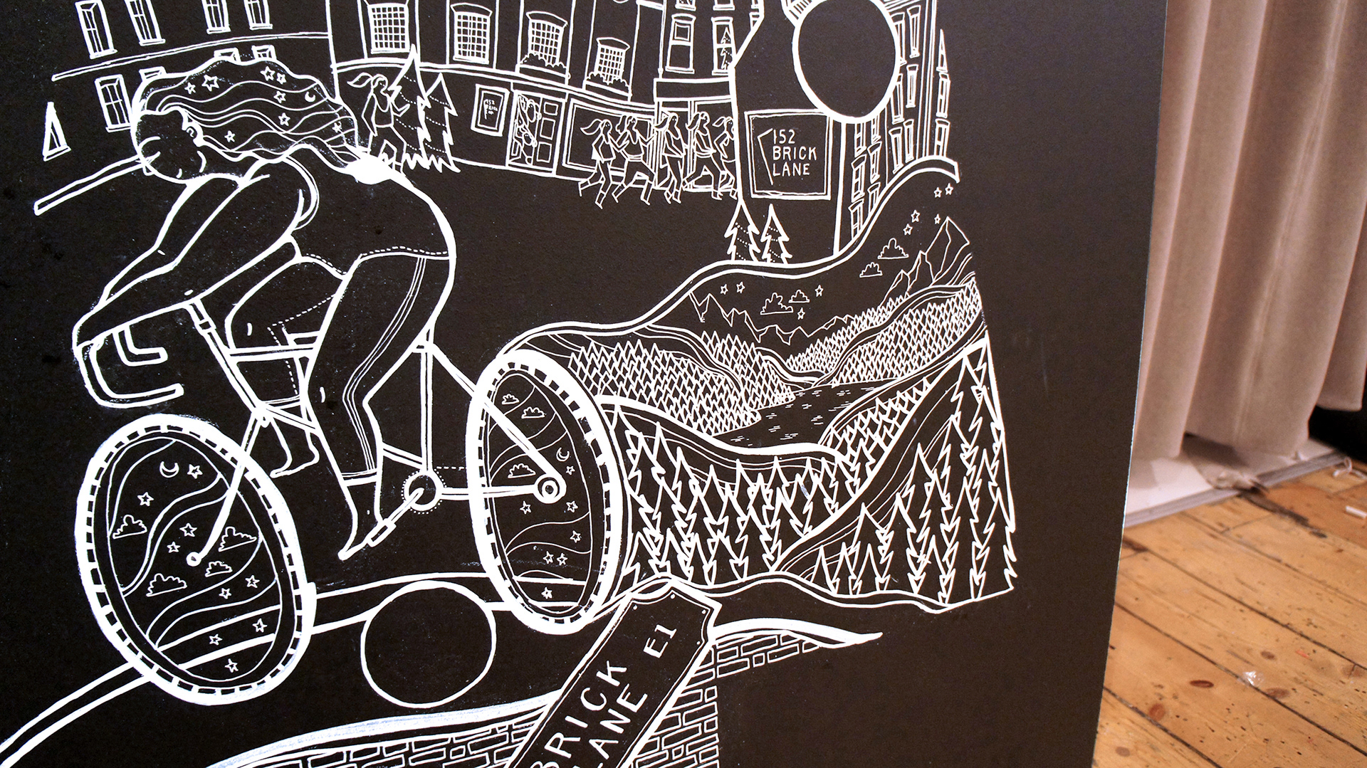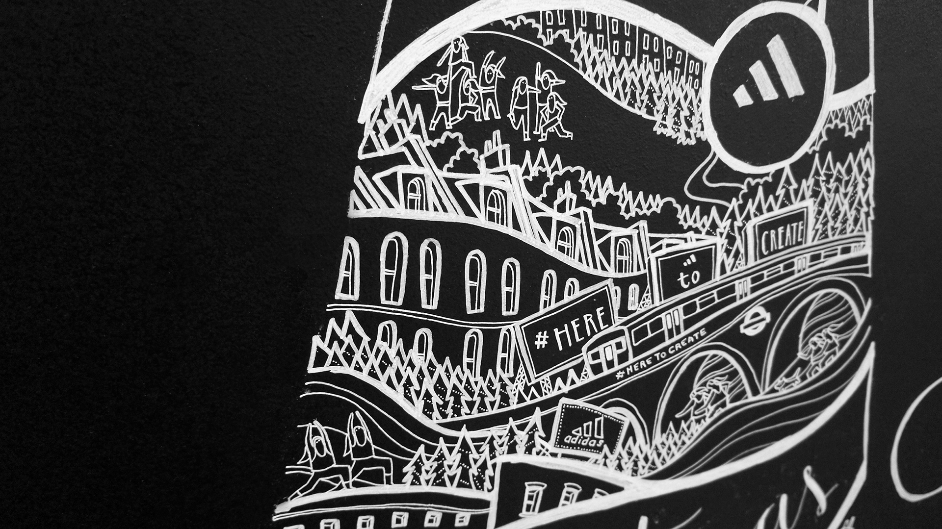 I was asked by the Adidas Fitness Studio at 152 Brick Lane to do a Christmas mural on a large blackboard. I spent the day drawing and managed to make a quick time lapse of its progress throughout the day.