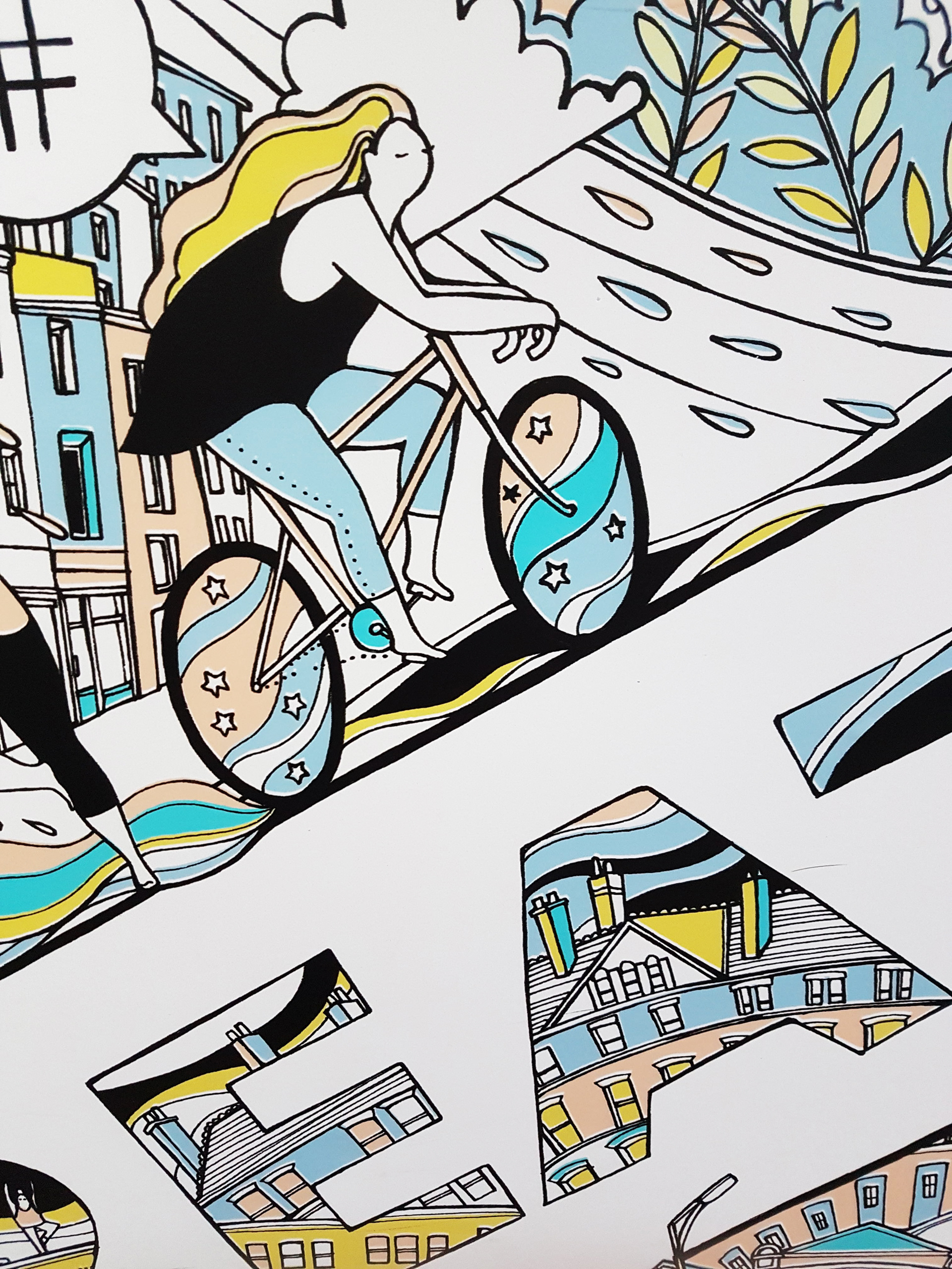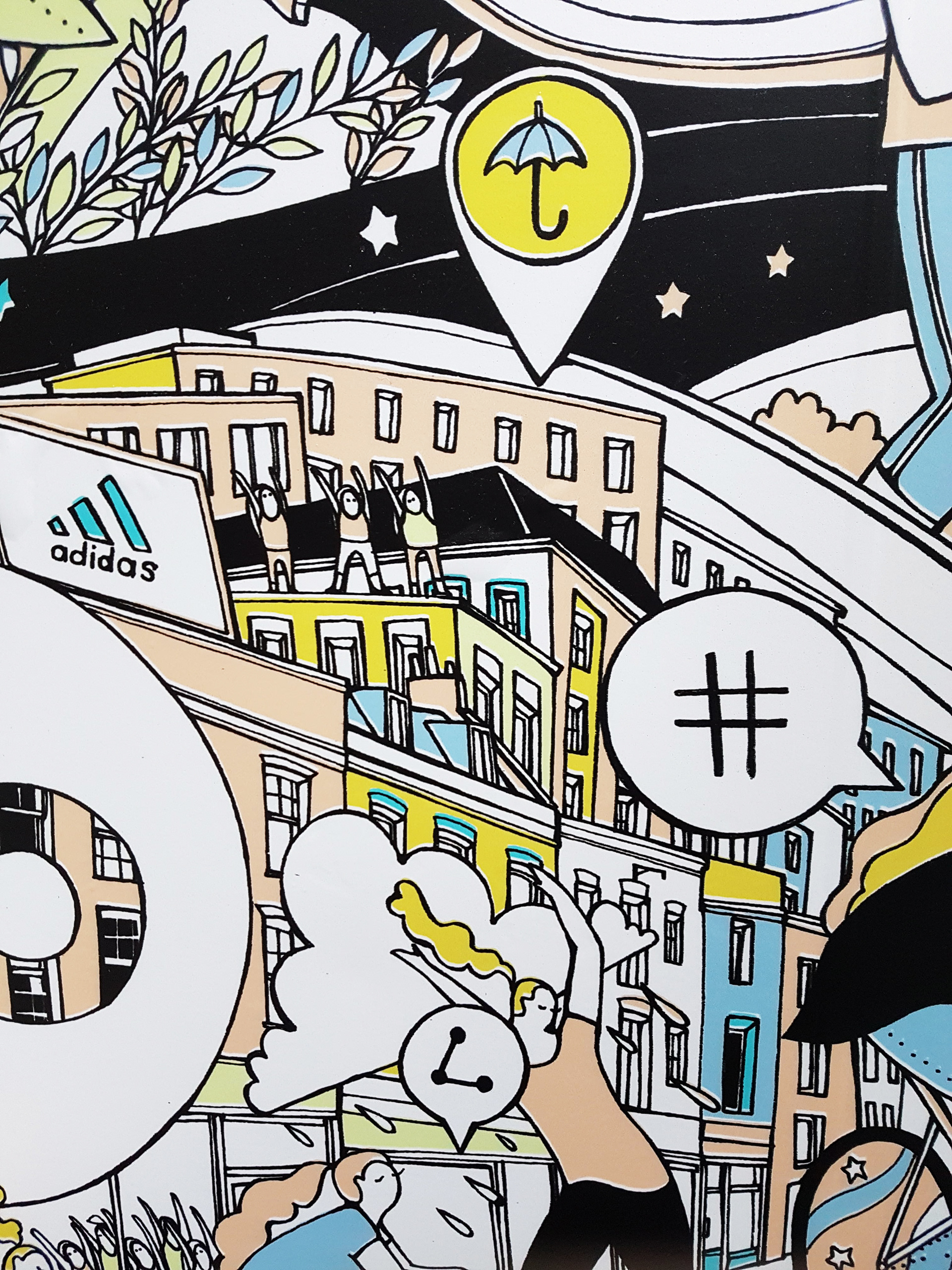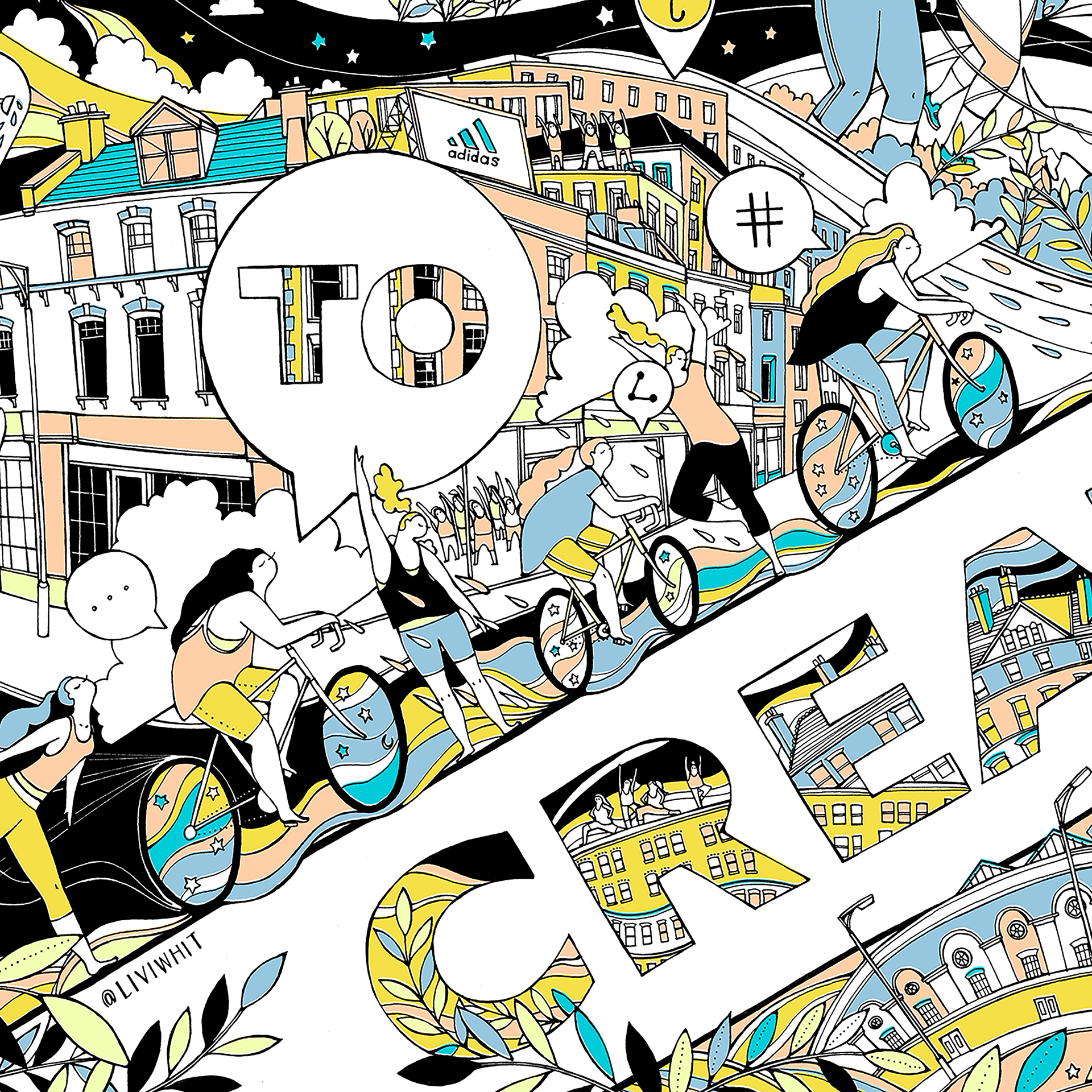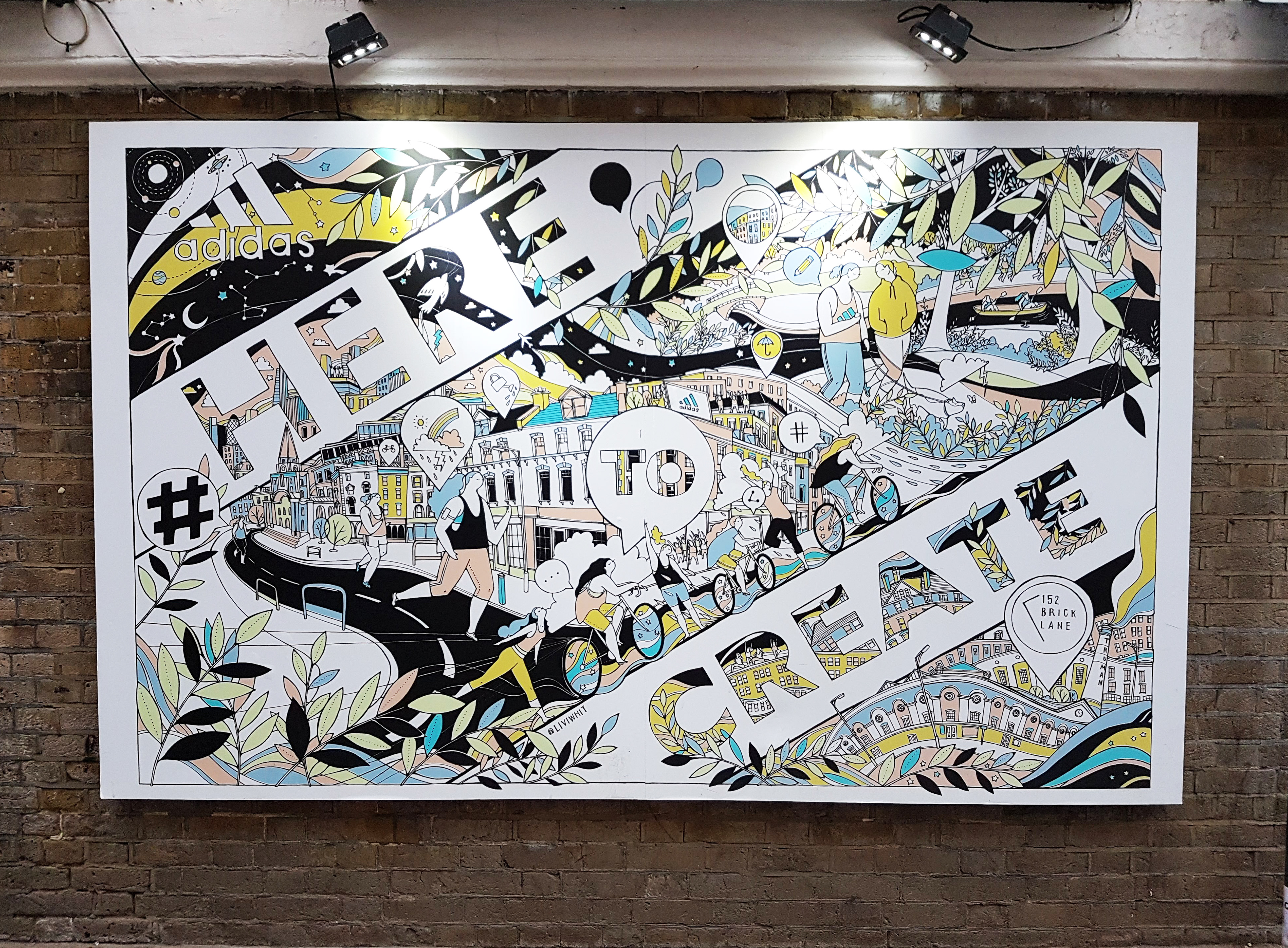 I was asked by the Adidas Studio LDN to produce a second mural for outside their studio on Brick Lane. The illustration was centred around themes of spring, colour, women, fitness and creativity.