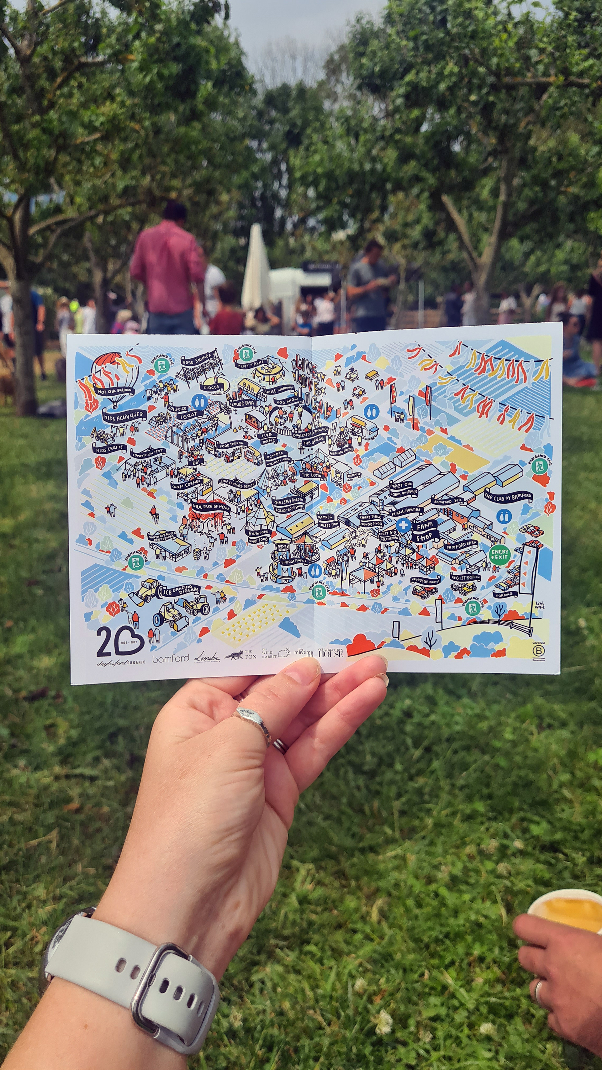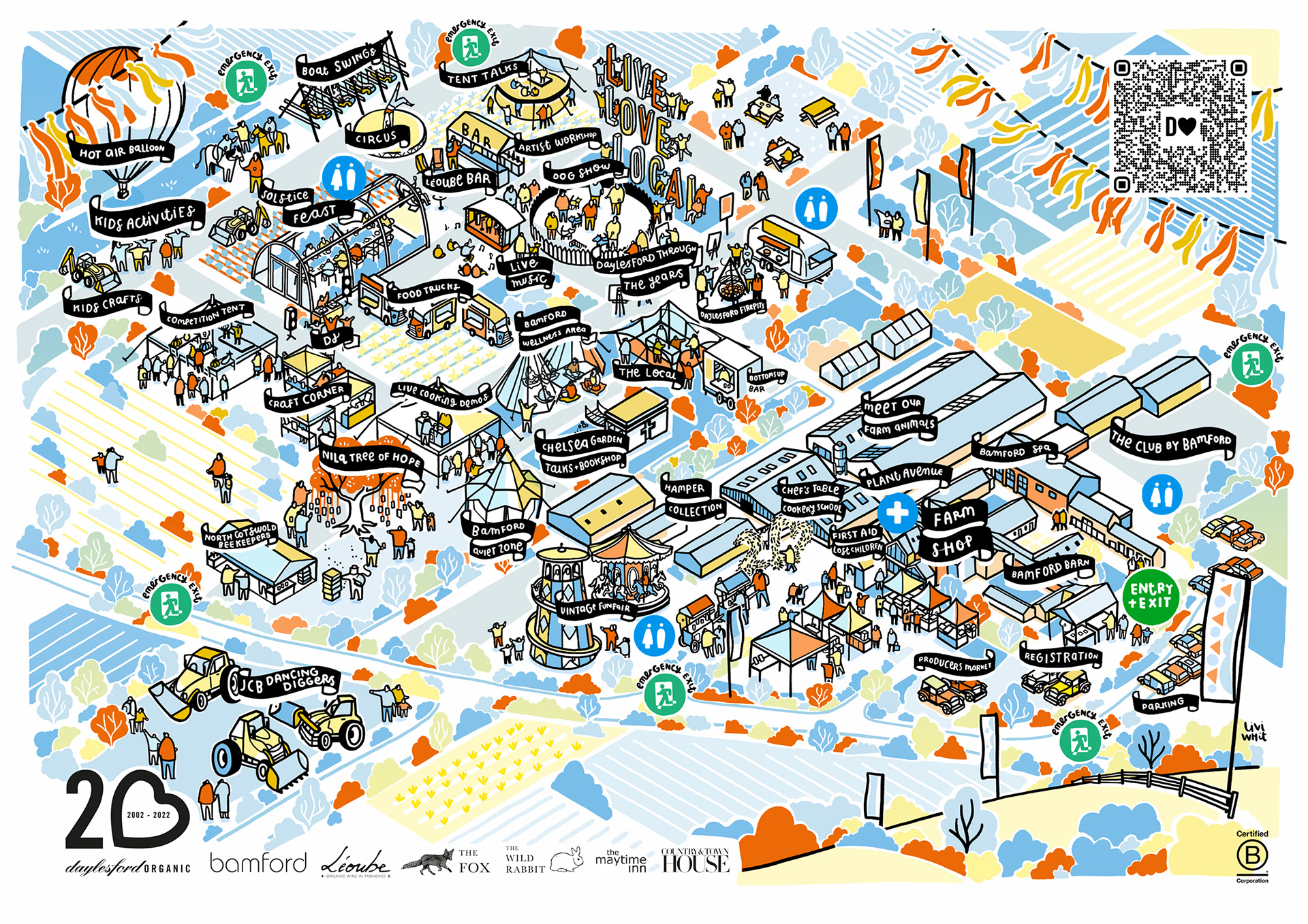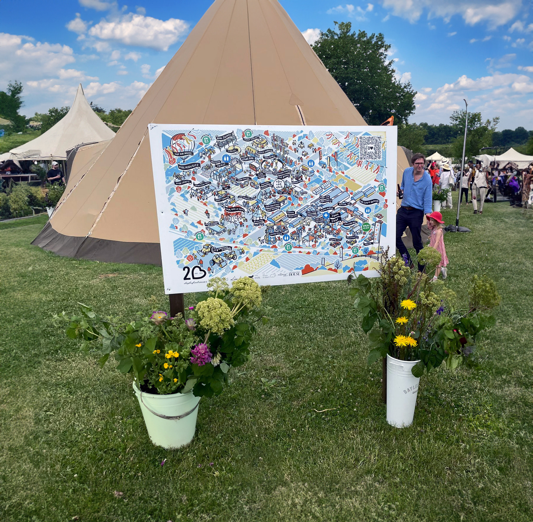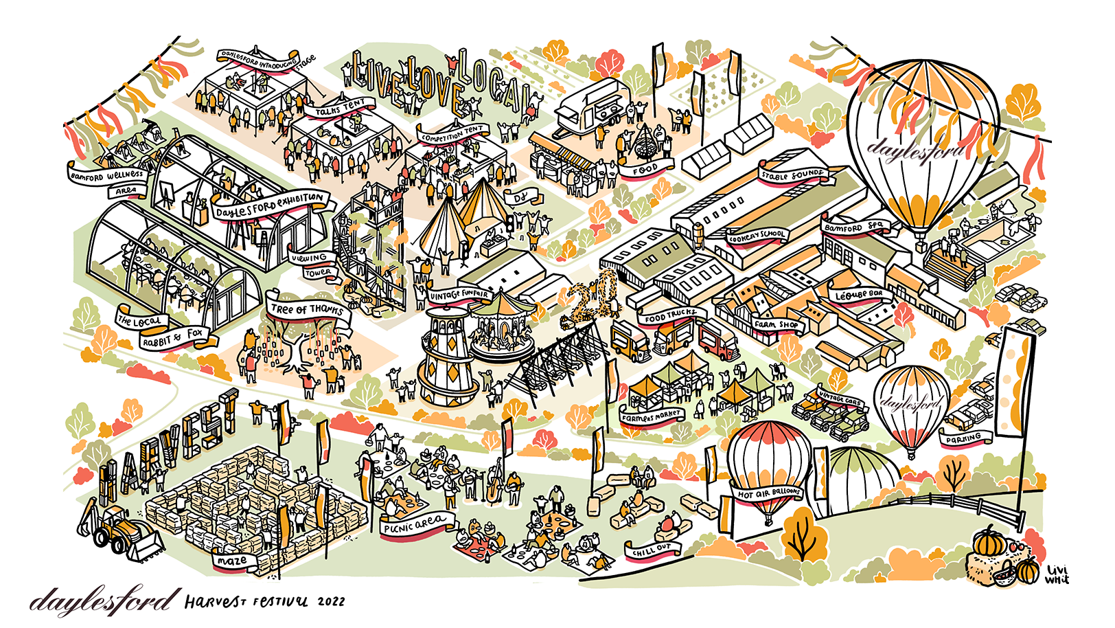 Site map illustration for Daylesford Farm Festival - Originally an autumn harvest festival until rescheduled to summer, resulting in a colour palette change.