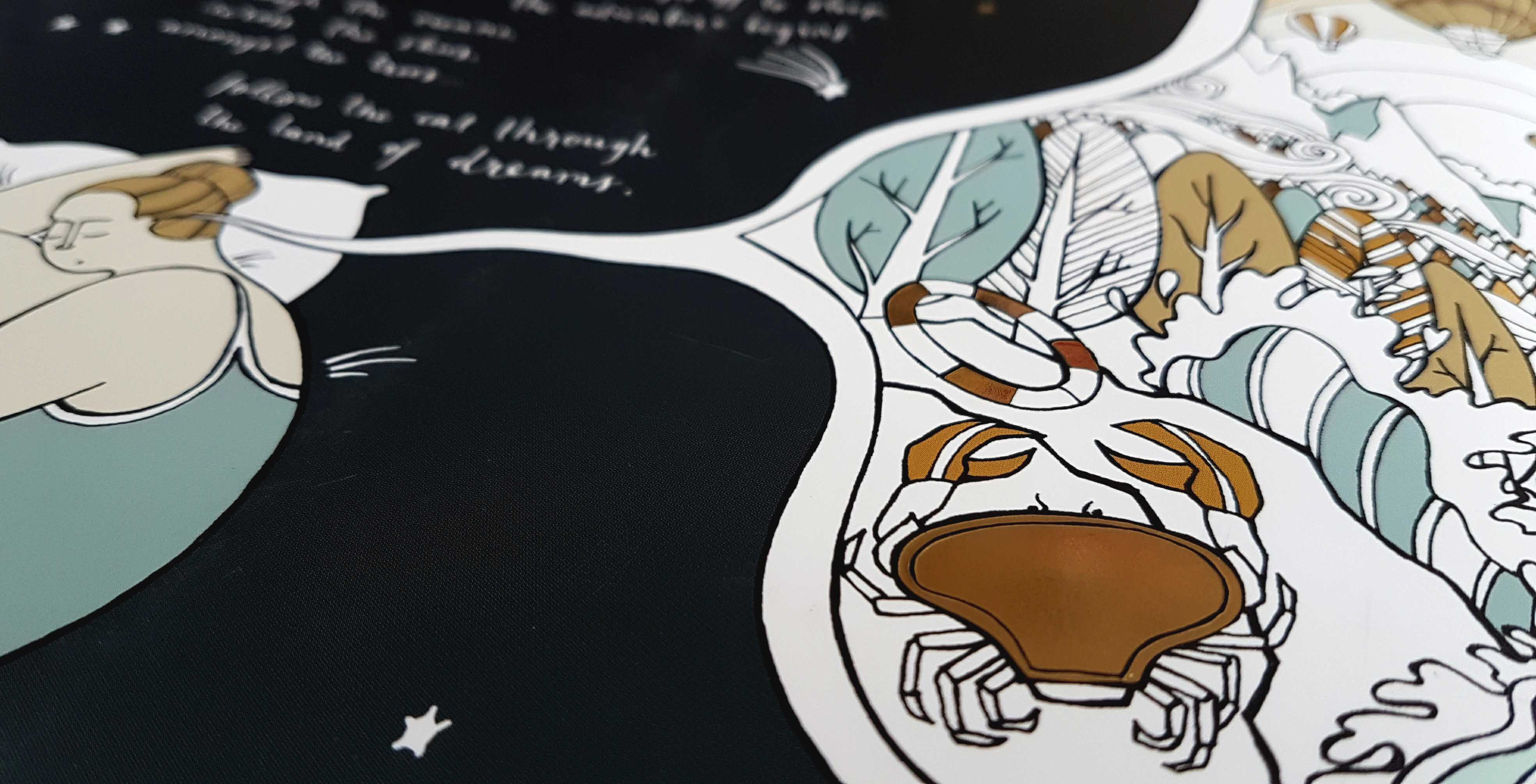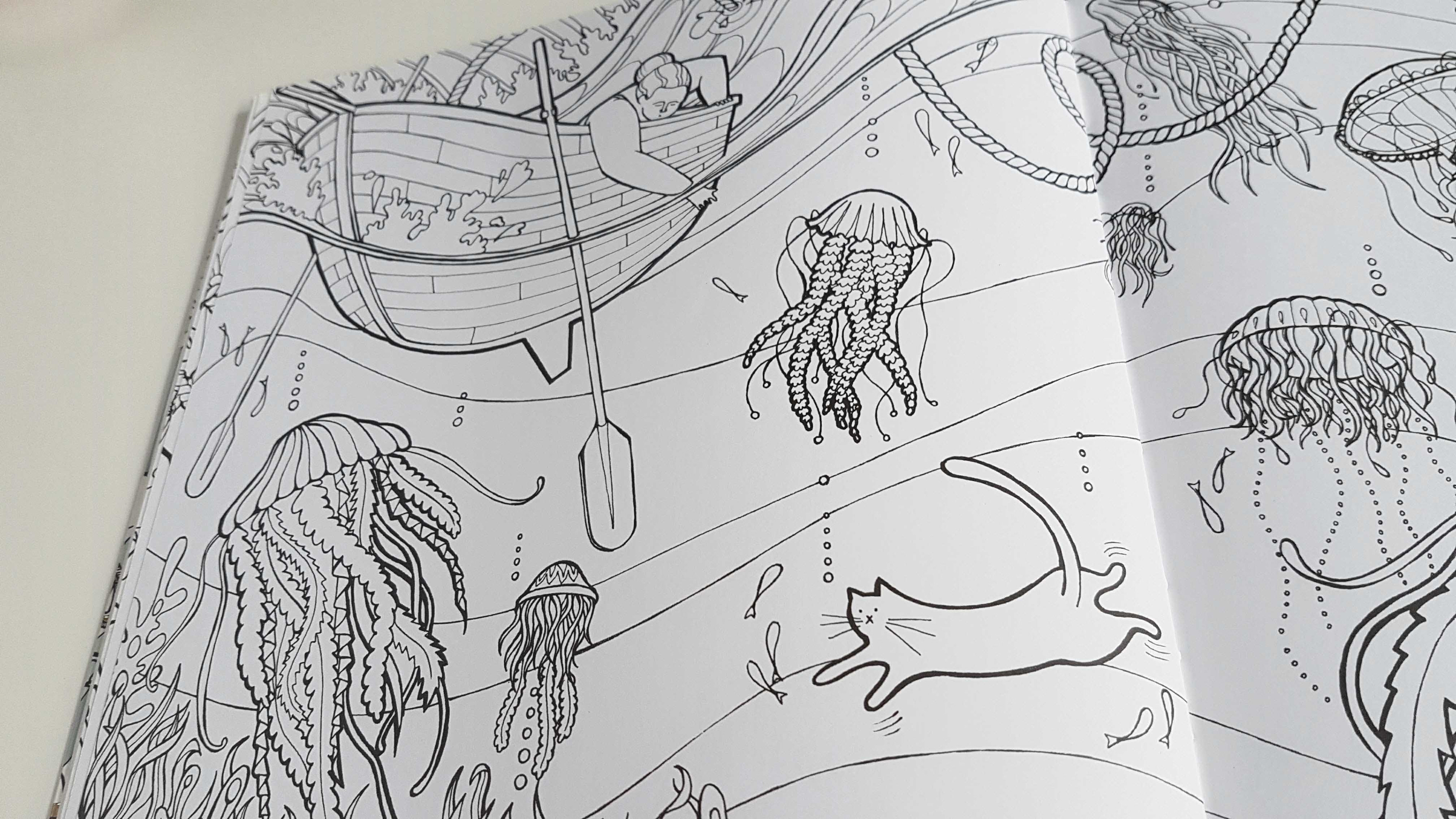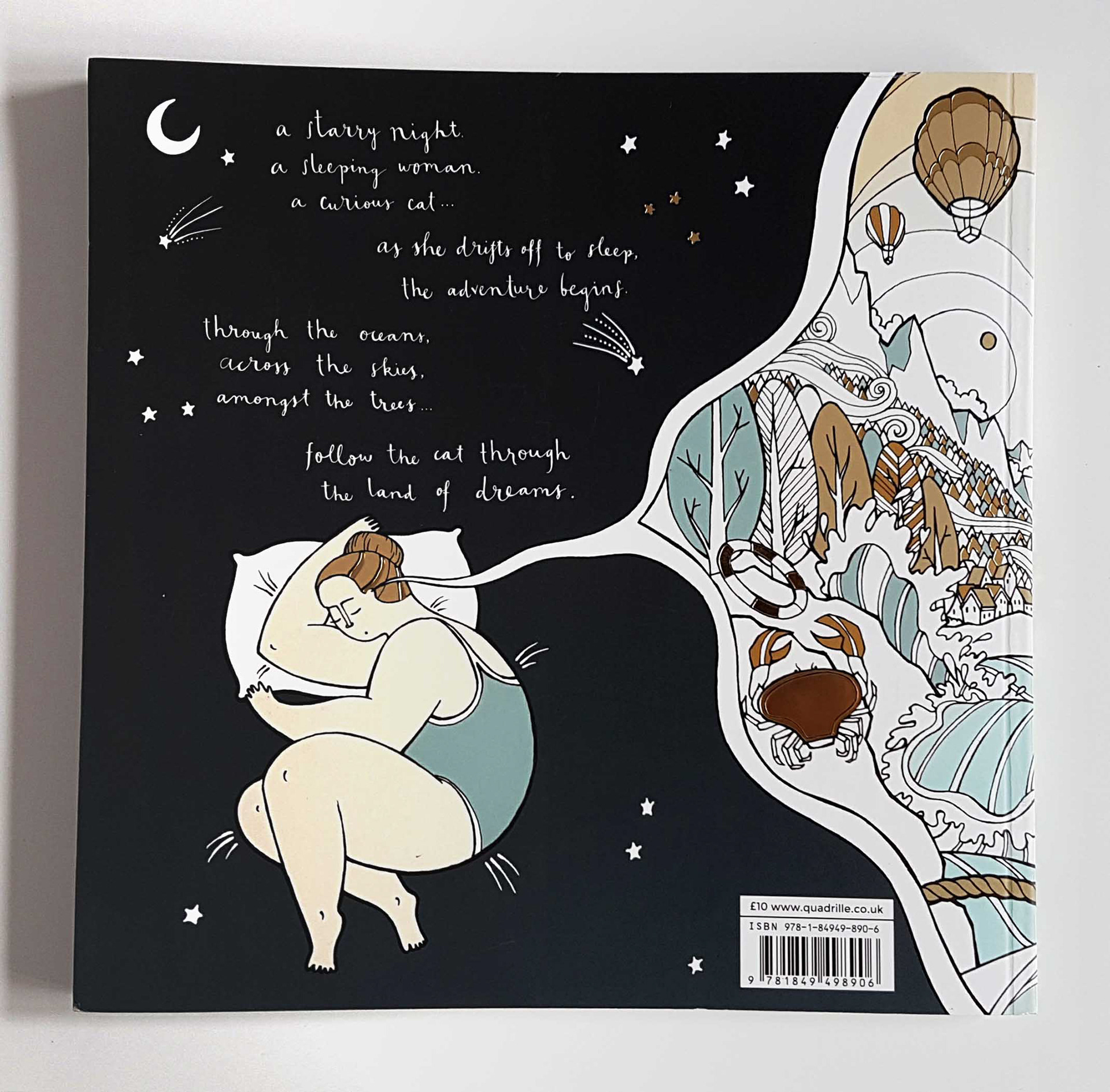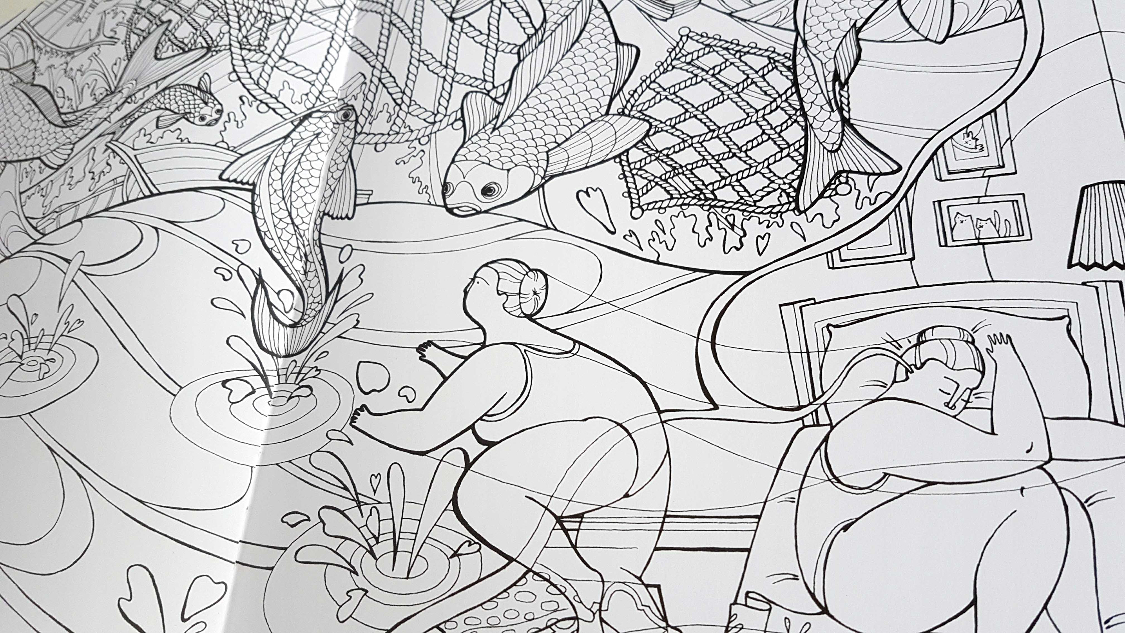 A selection of some spreads from my recently published colouring book with Quadrille Publishing. The colouring book follows a nameless woman through her dreams as she tries to retrieve her cat.