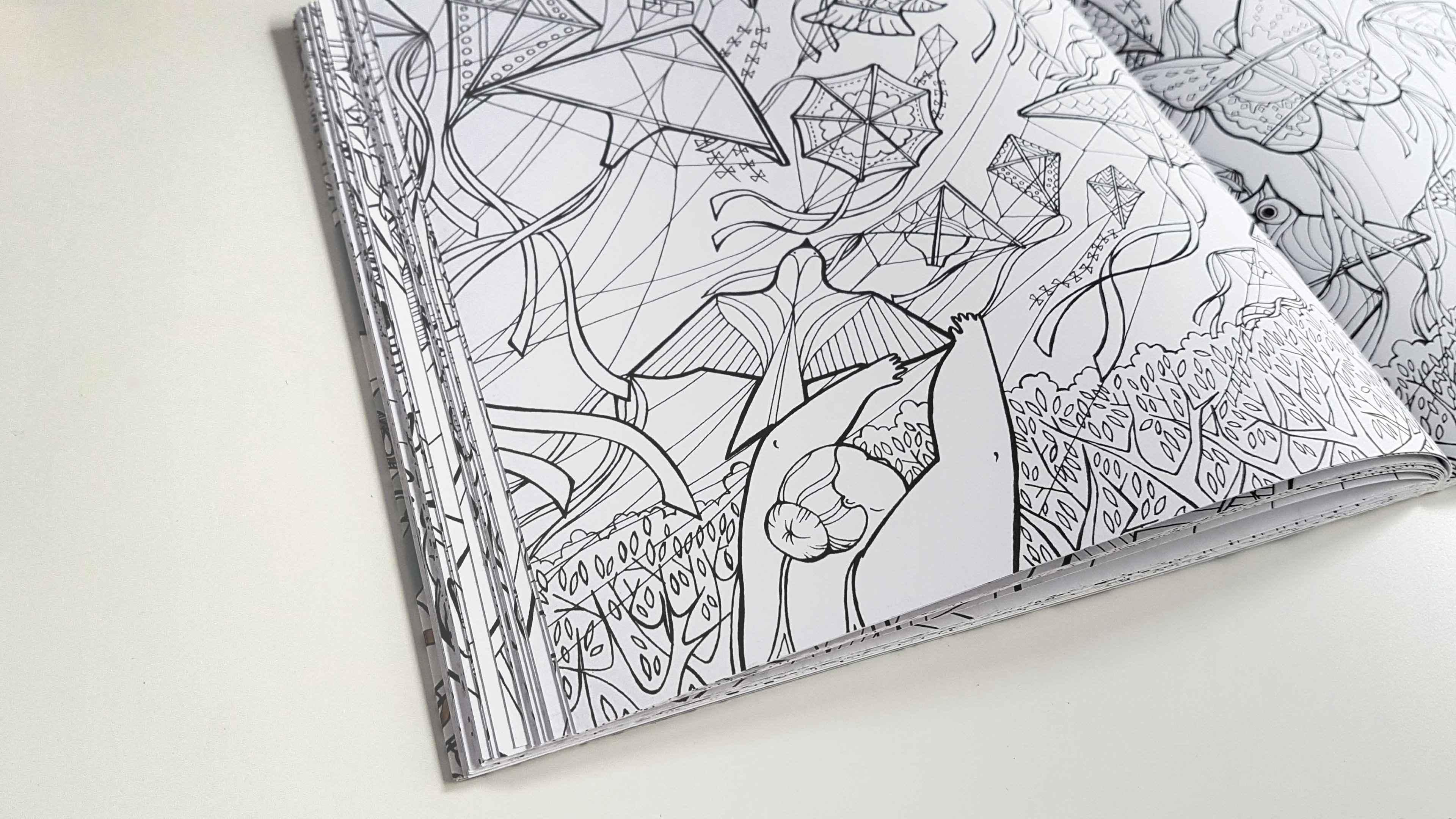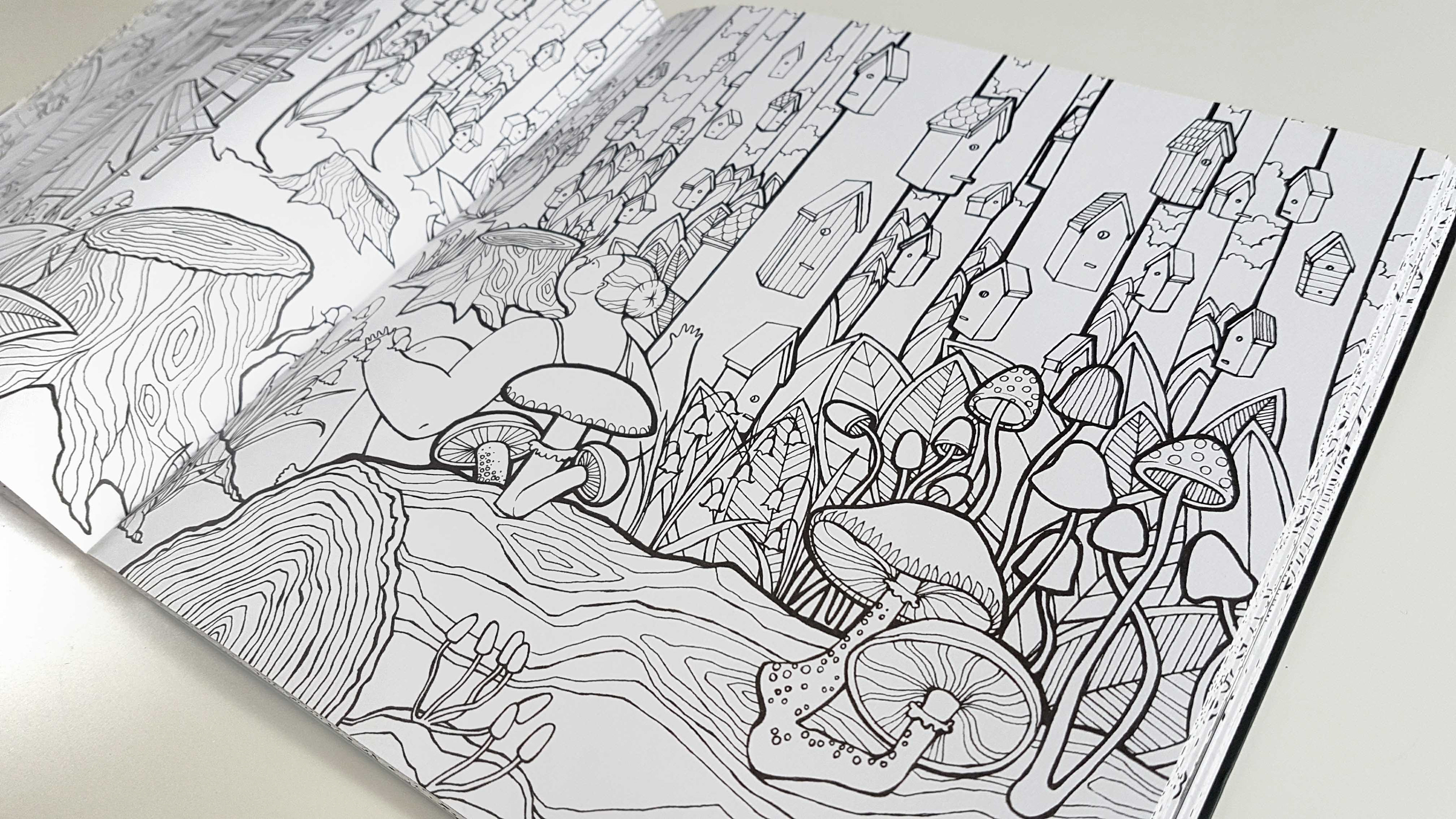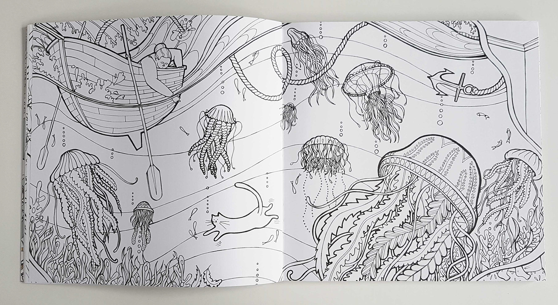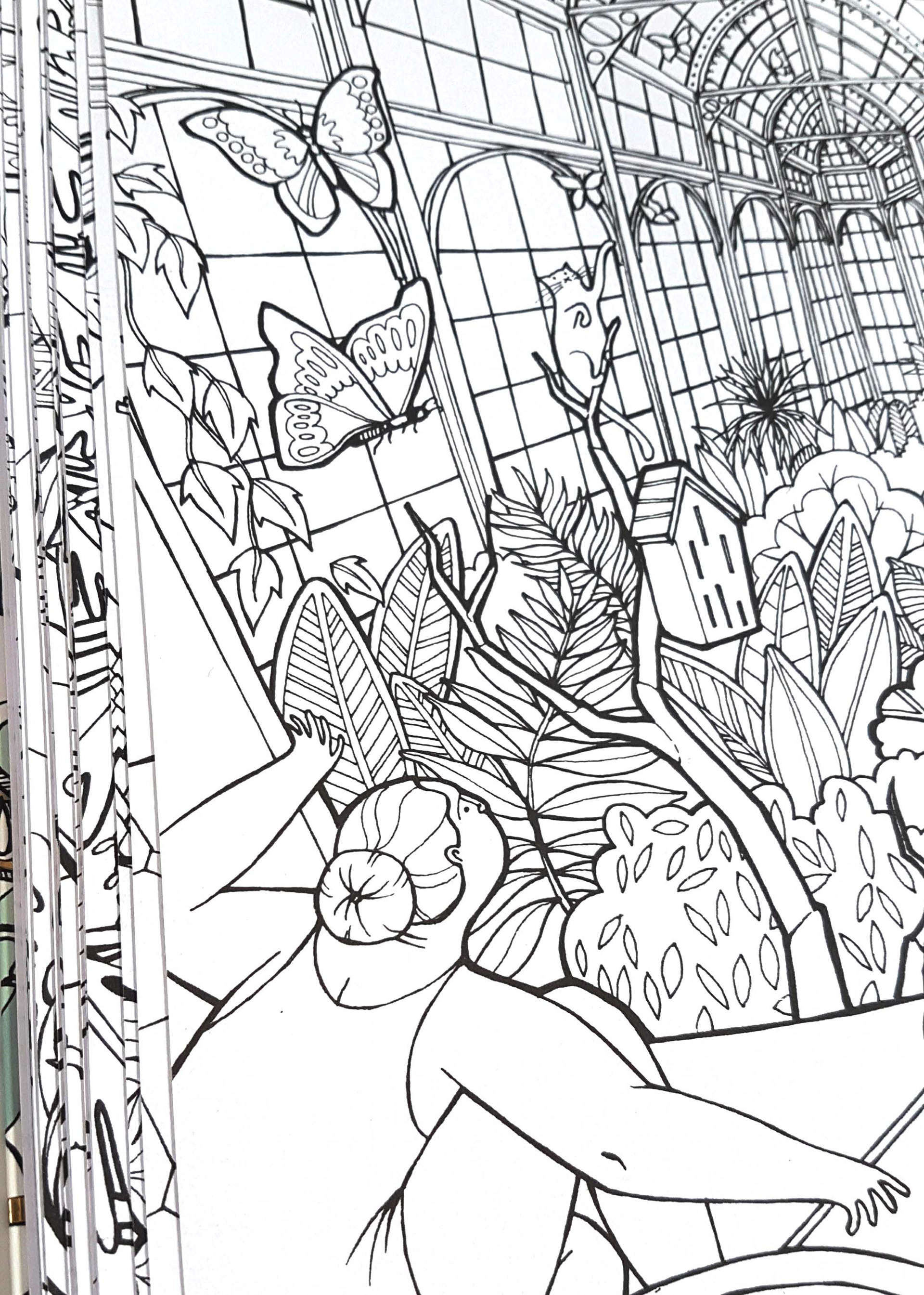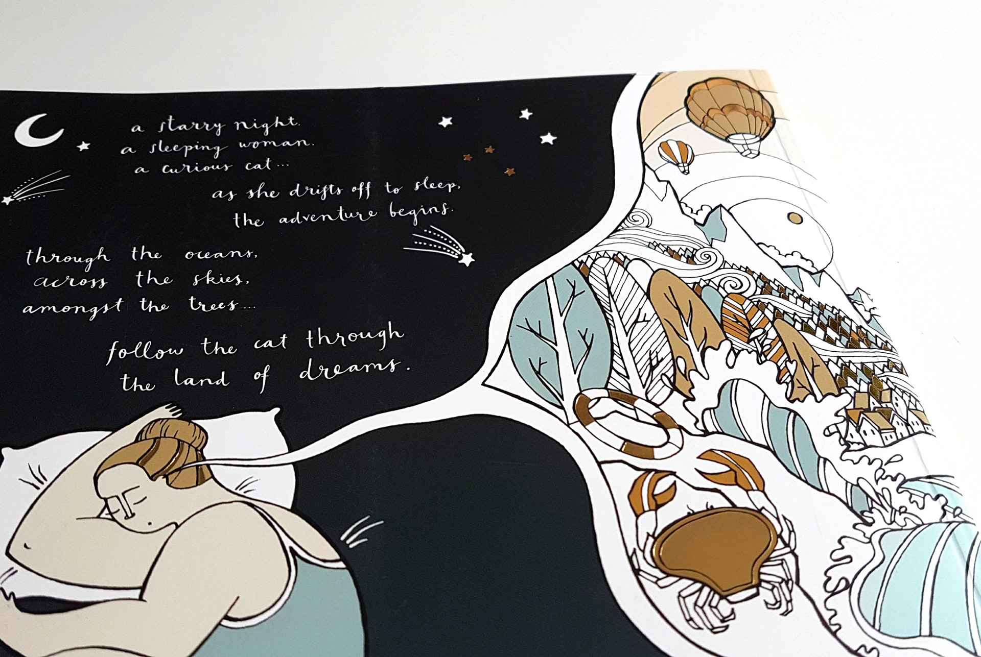 A selection of some spreads from my recently published colouring book with Quadrille Publishing. The colouring book follows a nameless woman through her dreams as she tries to retrieve her cat.