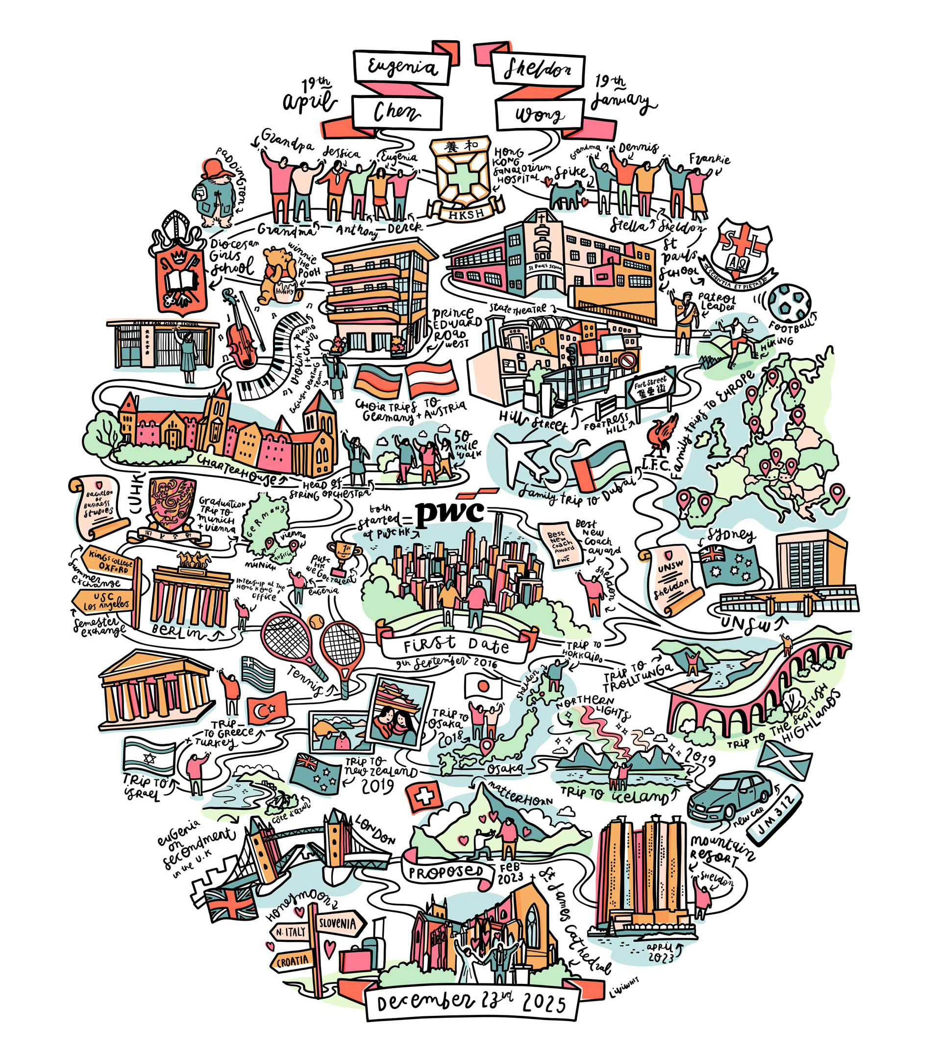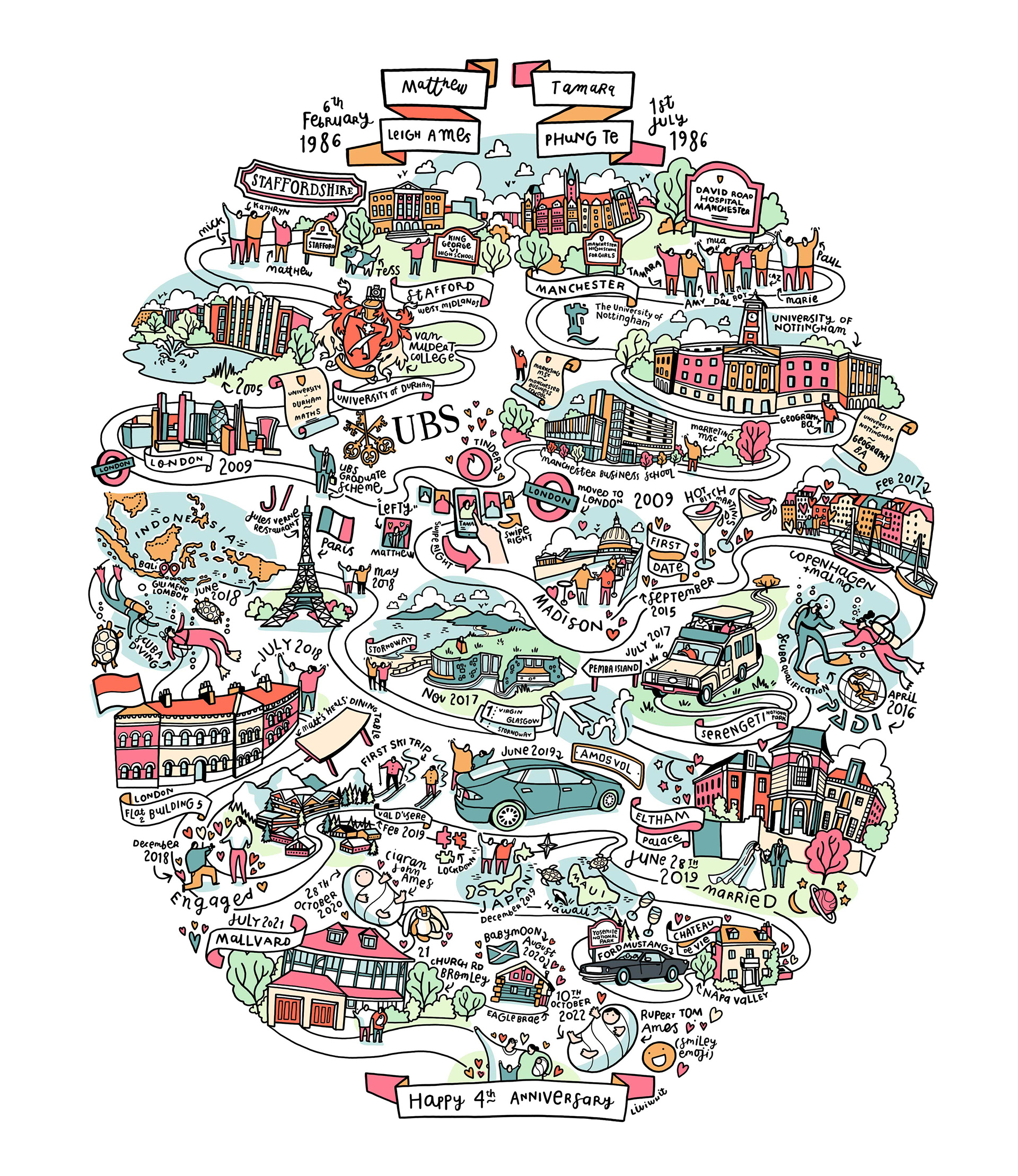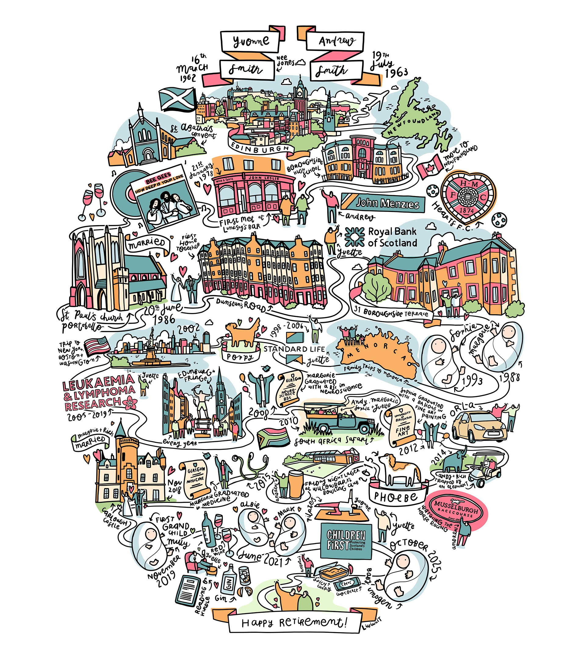 Since 'laying' that first egg in 2014, I’ve created over a hundred bespoke illustrations for individuals and couples, each one put together from memories, milestones, and meaningful details. Each egg is a one-of-a-kind illustrated timeline, created to celebrate a life, a relationship, or a shared story. Drawn digitally from scratch and printed to gallery standards, eggs make thoughtful gifts for weddings, anniversaries, birthdays, retirement, or any moment worth celebrating. No two eggs are ever the same.
