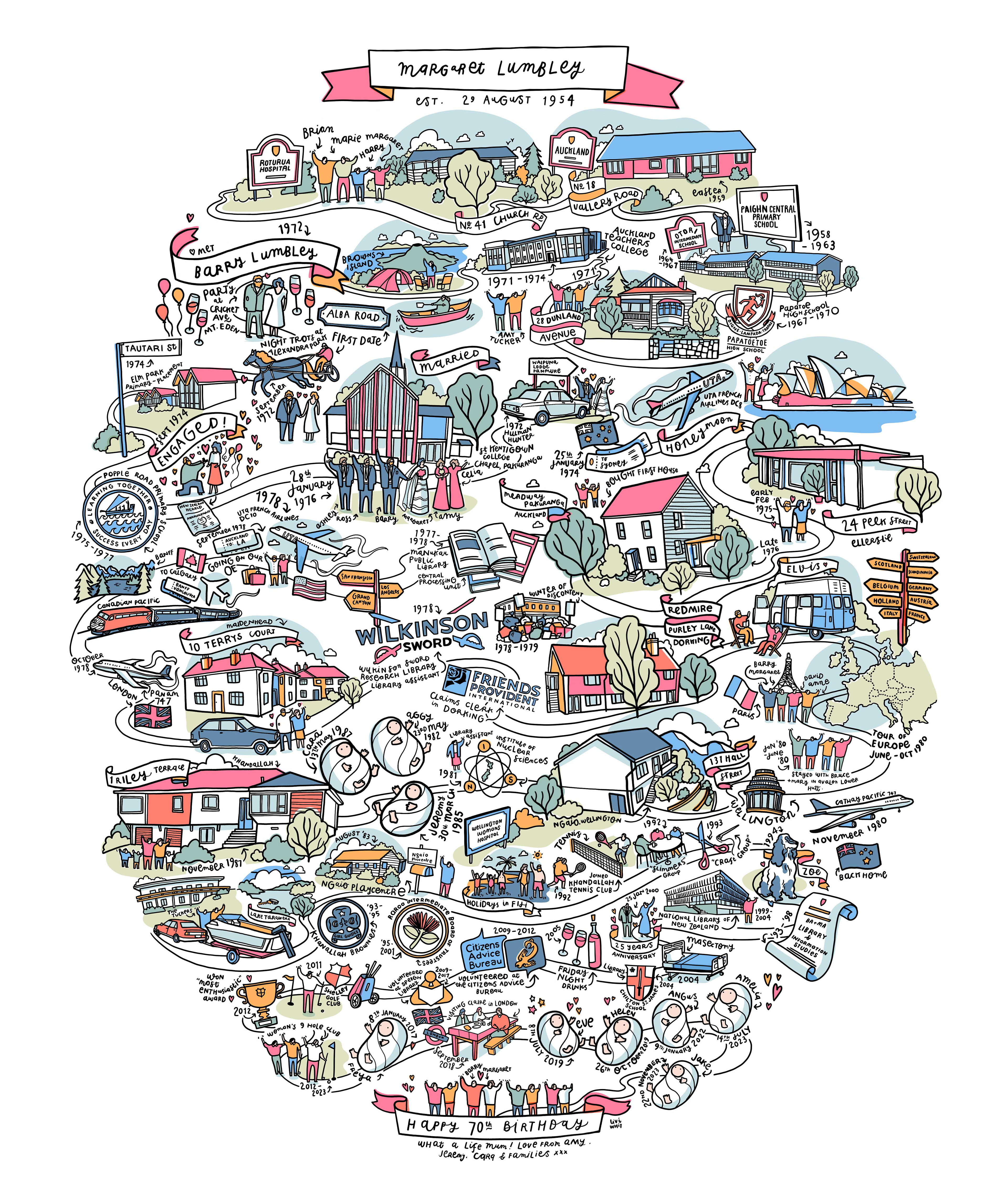 In 2014, a close family friend asked me to draw an illustrated timeline of his wife's life for her 60th birthday. After collecting all the information, details and photographs I needed, I produced an oval shaped timeline that we printed and framed - and thus the "egg" illustration was born (or should I say, laid....)
