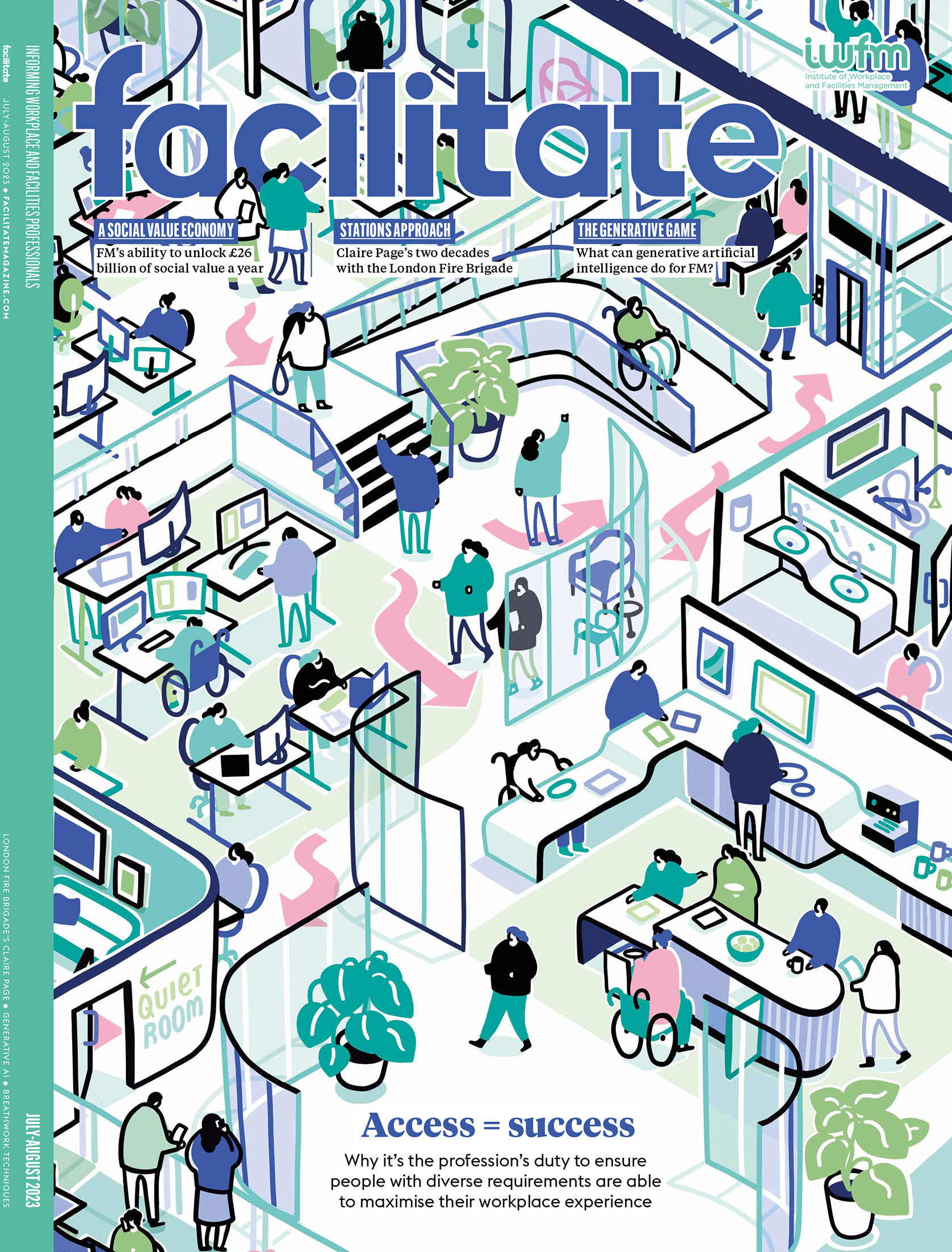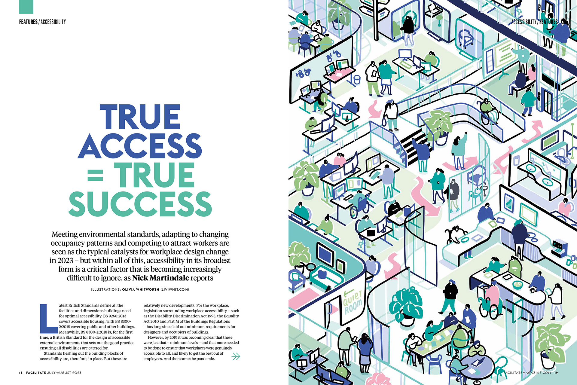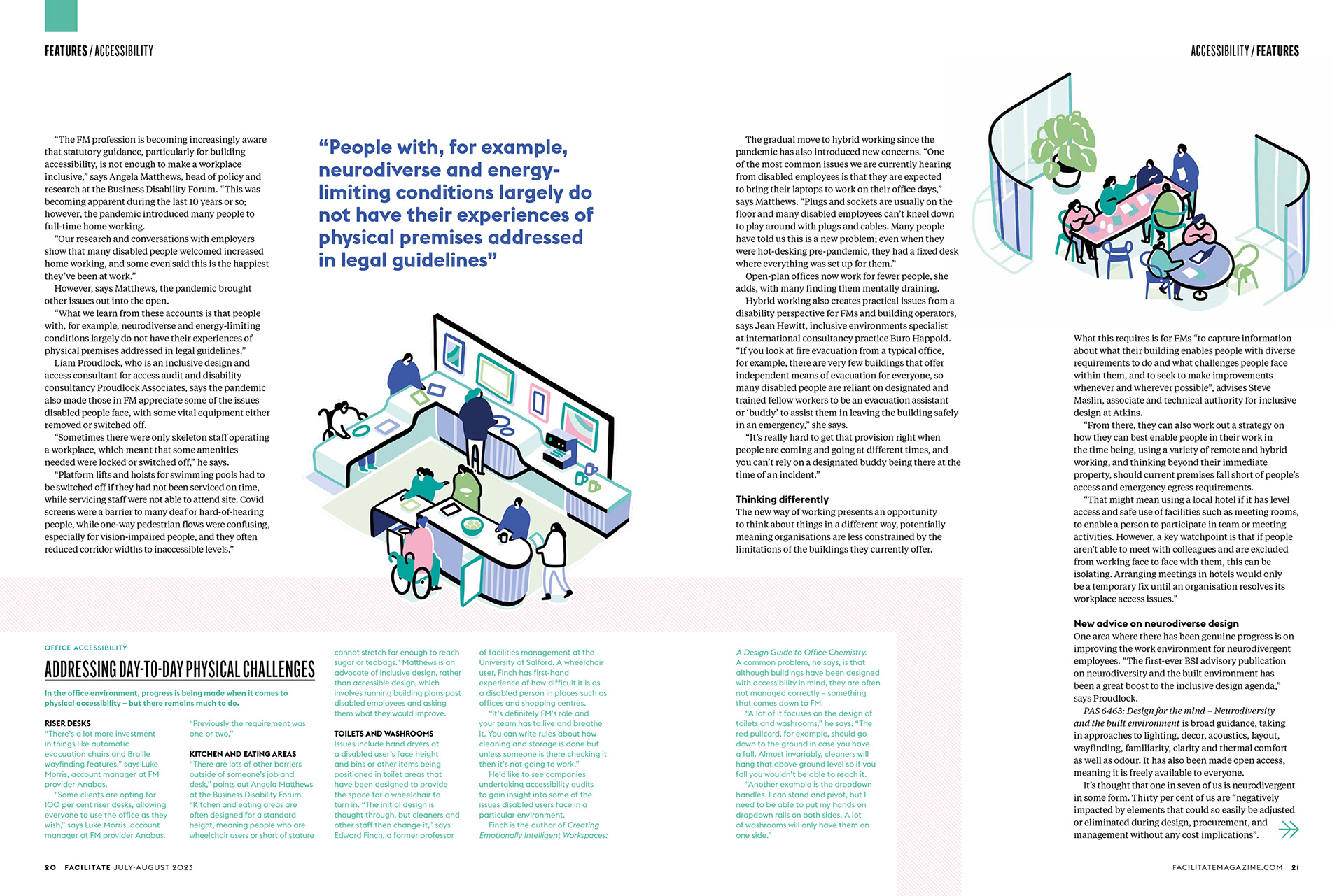 Cover illustration and internal spread + spots for Facilitate magazine, for an article on designing for better accessibility in the workplace.