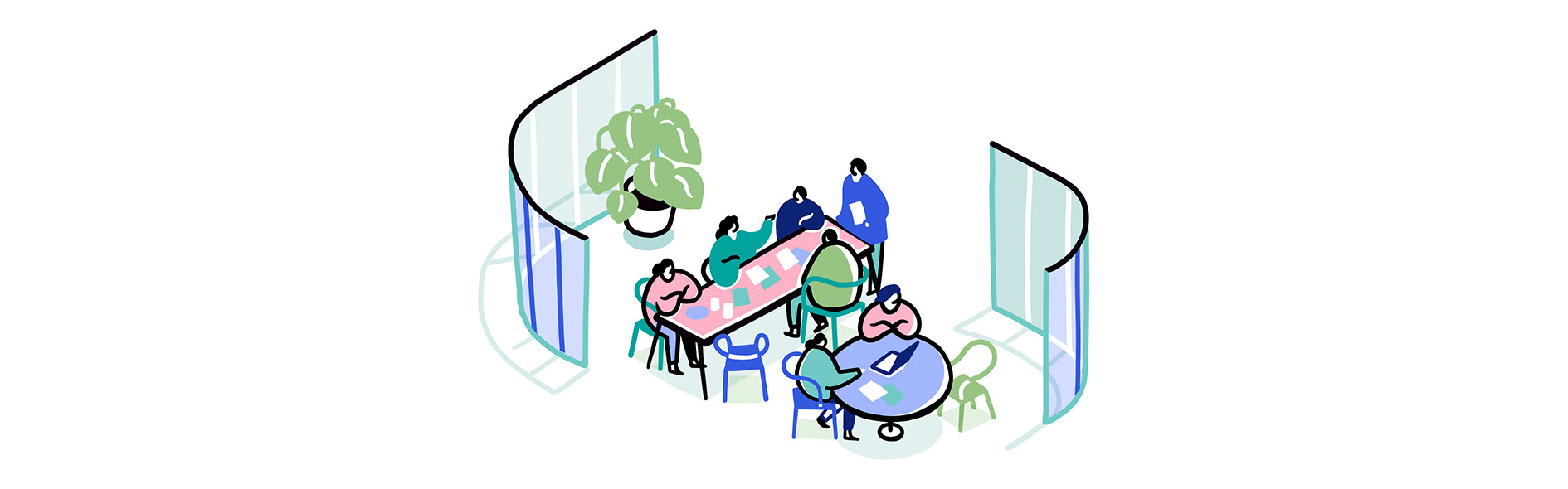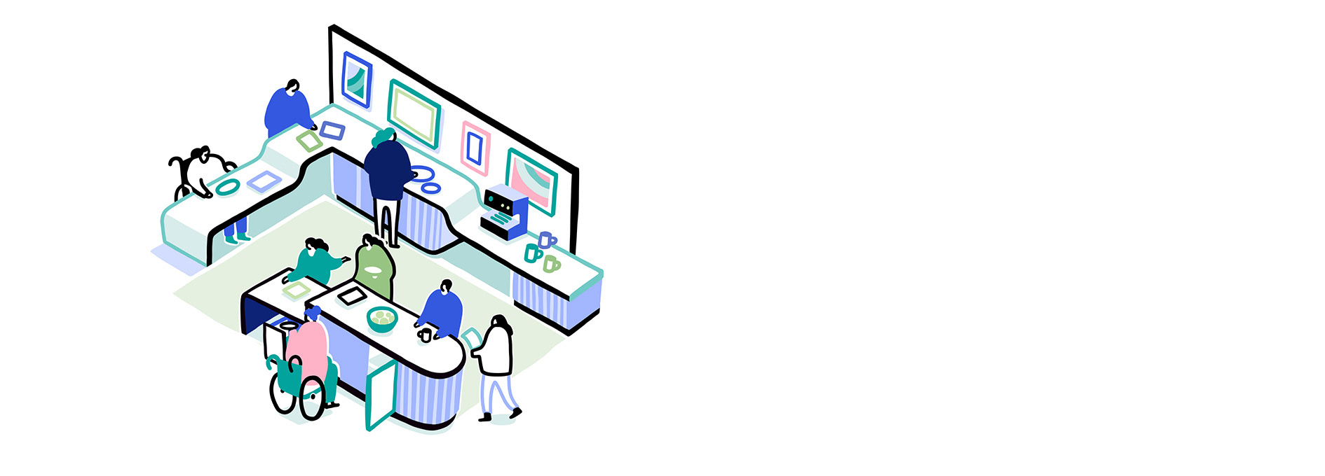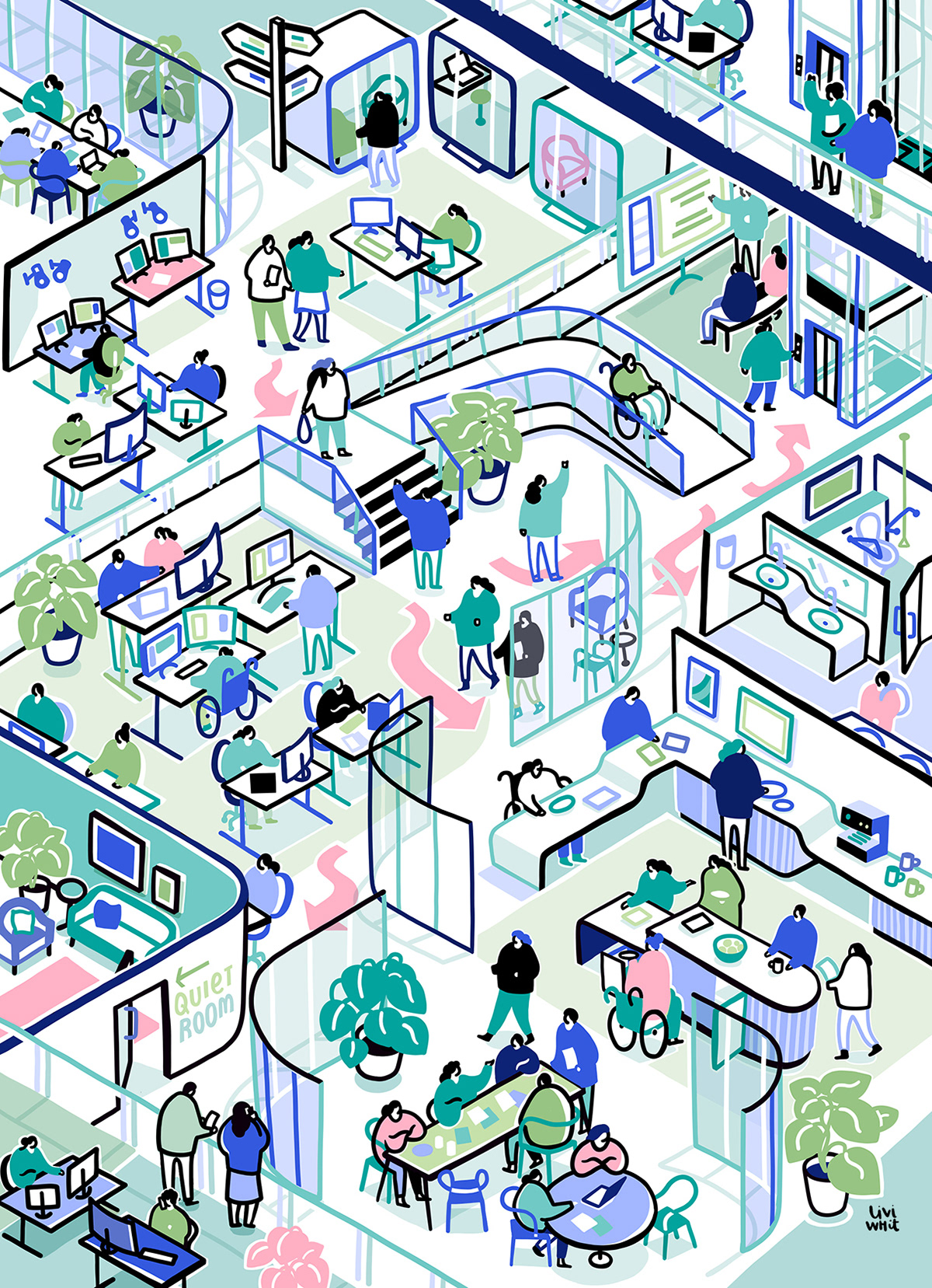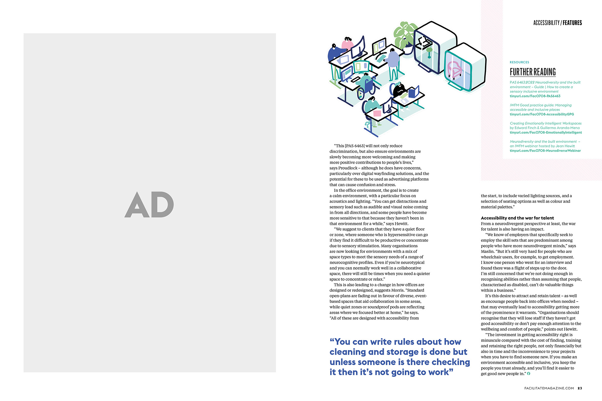 Cover illustration and internal spread + spots for Facilitate magazine, for an article on designing for better accessibility in the workplace.