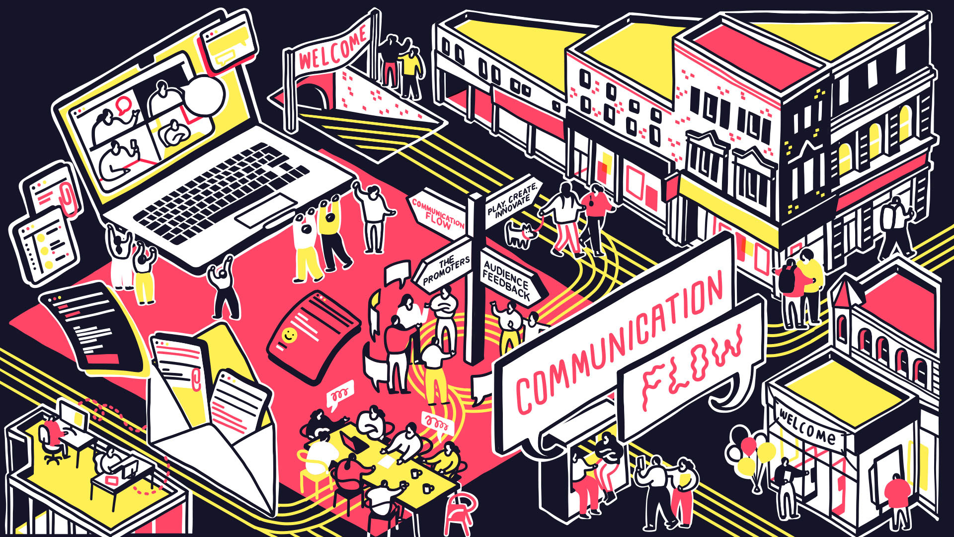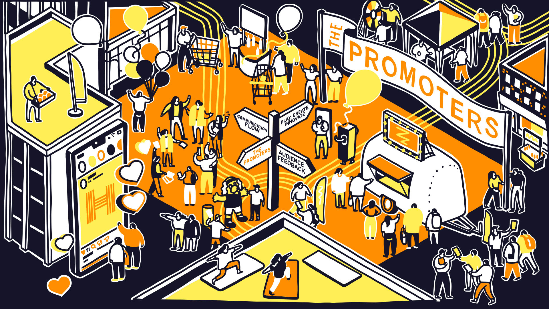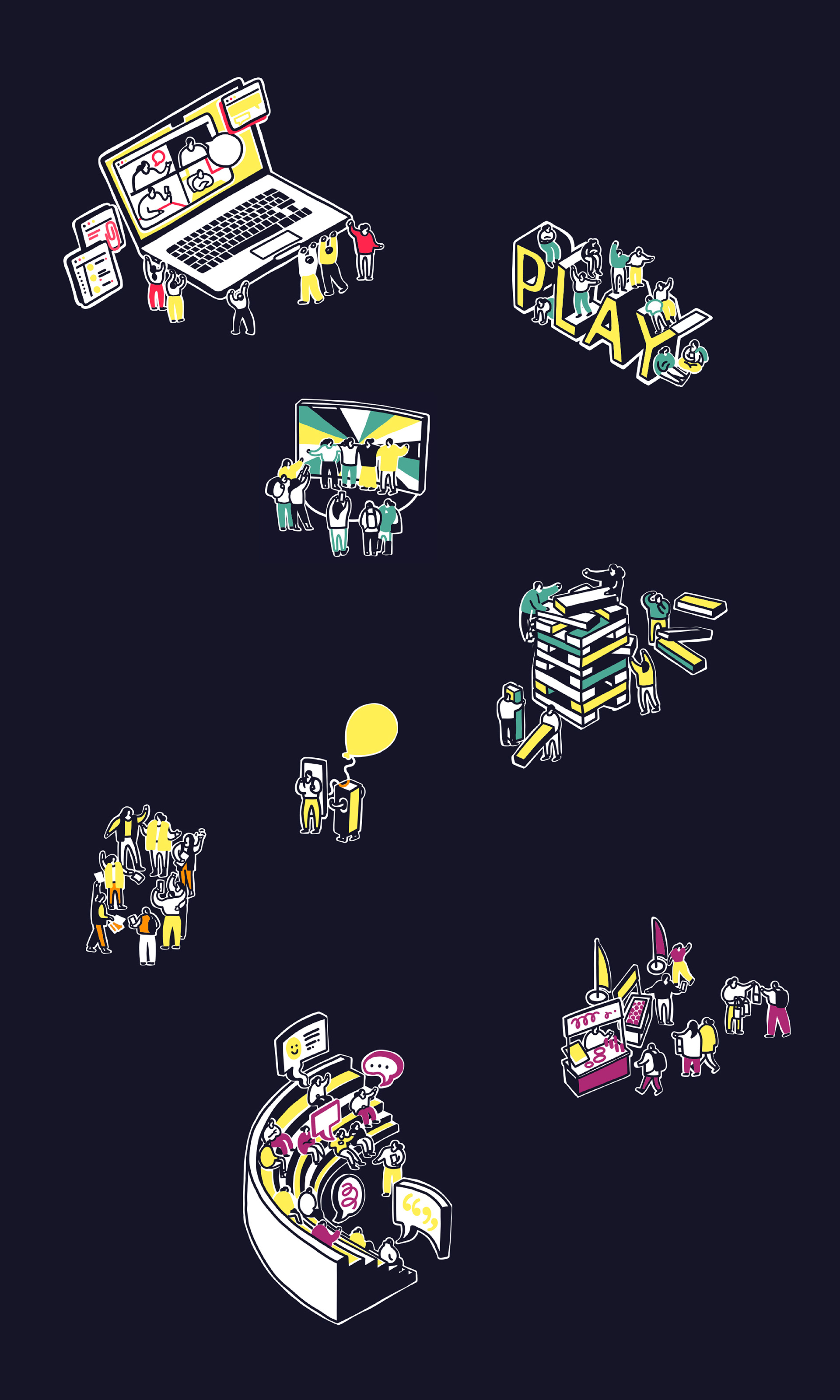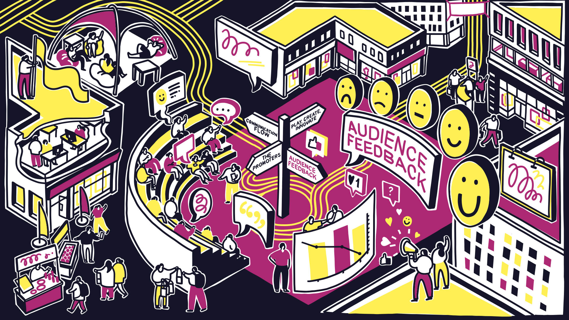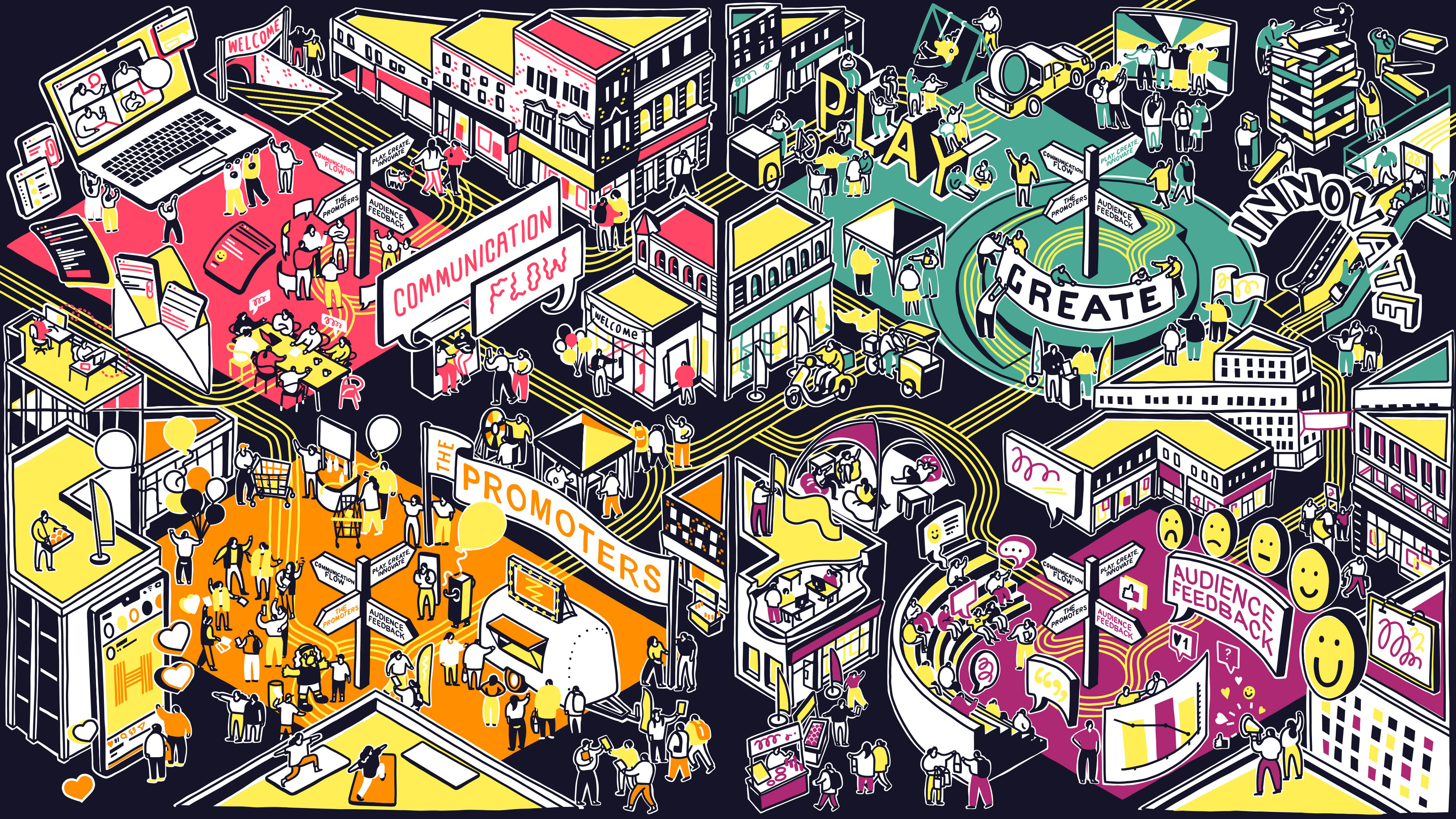 Marketing agency HIGHJAM required an illustration for their website that brought together their work and four core principles: Communication Flow; Play, Create, Innovate; The Promoters; and Audience Feedback. A single large illustration was developed to encapsulate these ideas, which could then be divided into four standalone visuals, each representing one principle. An isometric style was used as a unifying visual language, enabling different types and scales of information to be presented together while maintaining a clear and consistent identity across each principle when viewed individually.