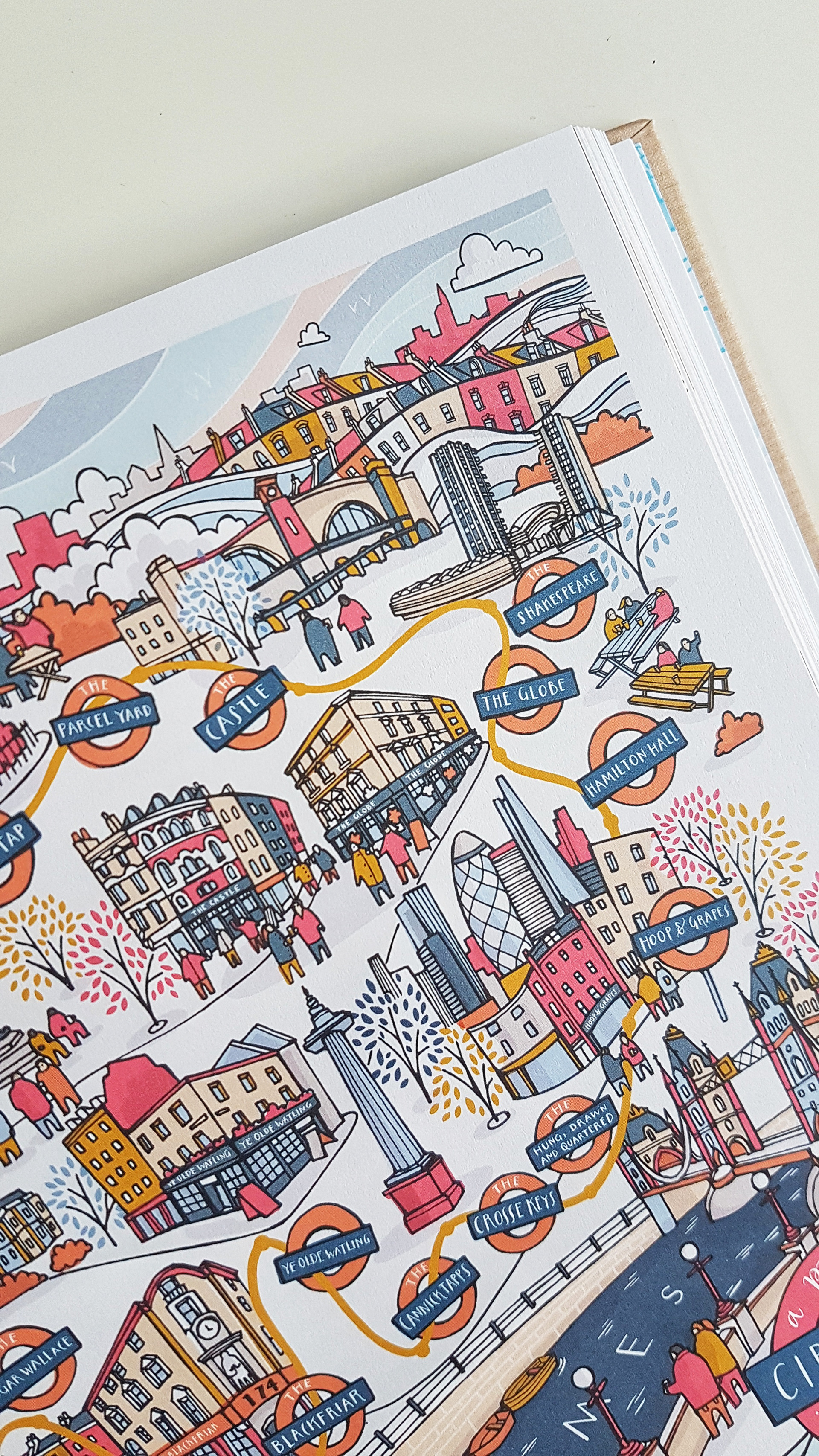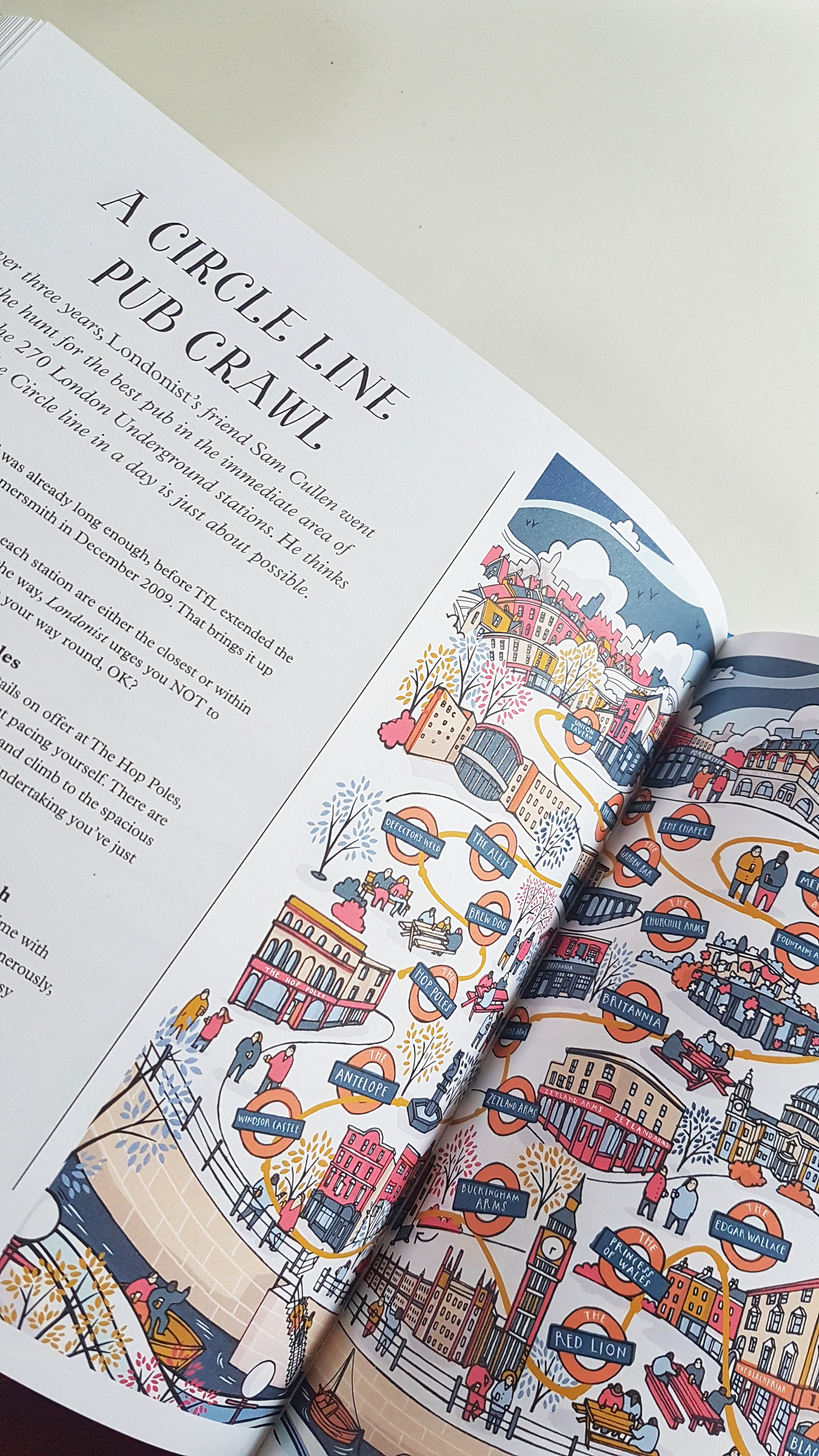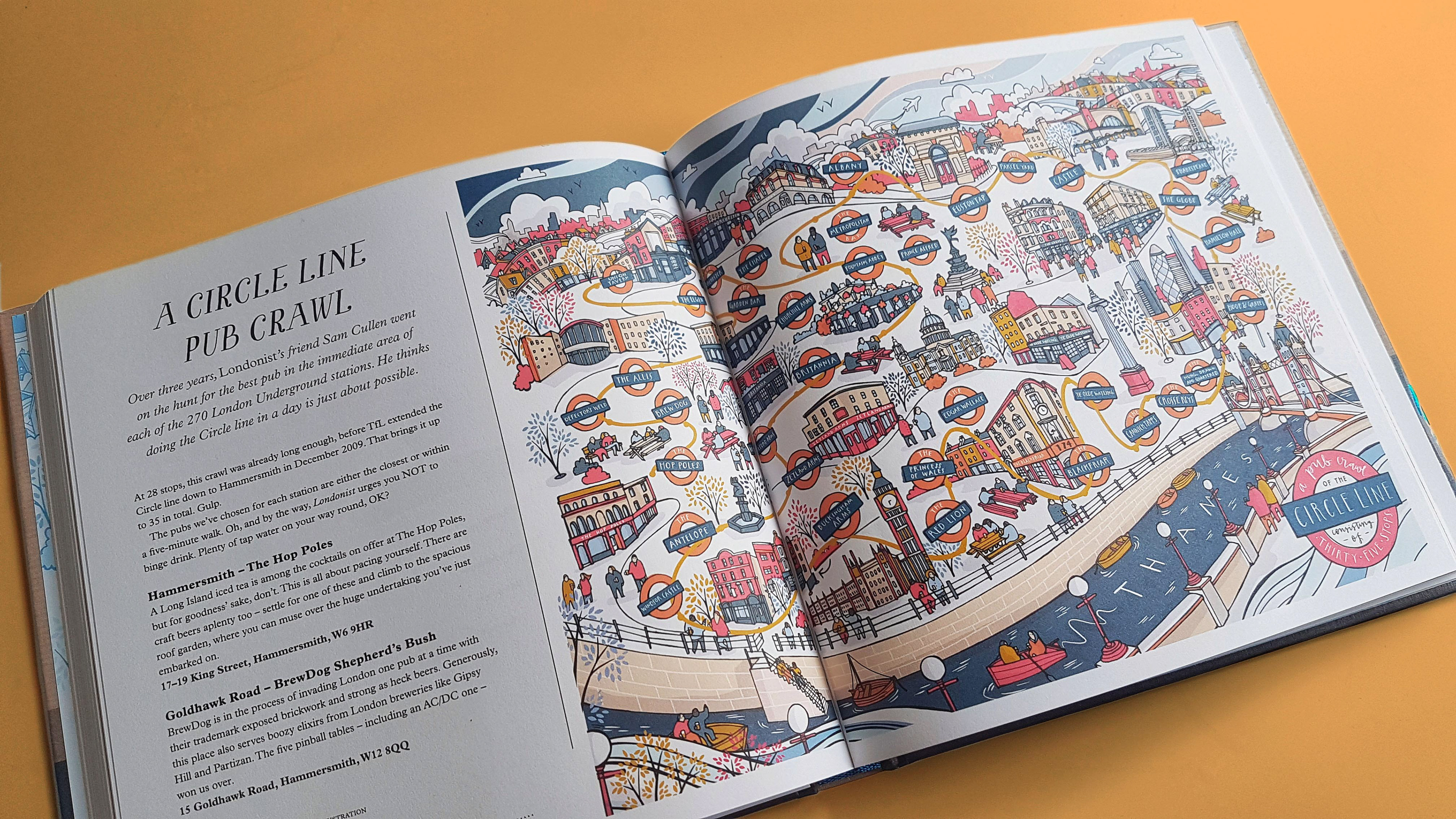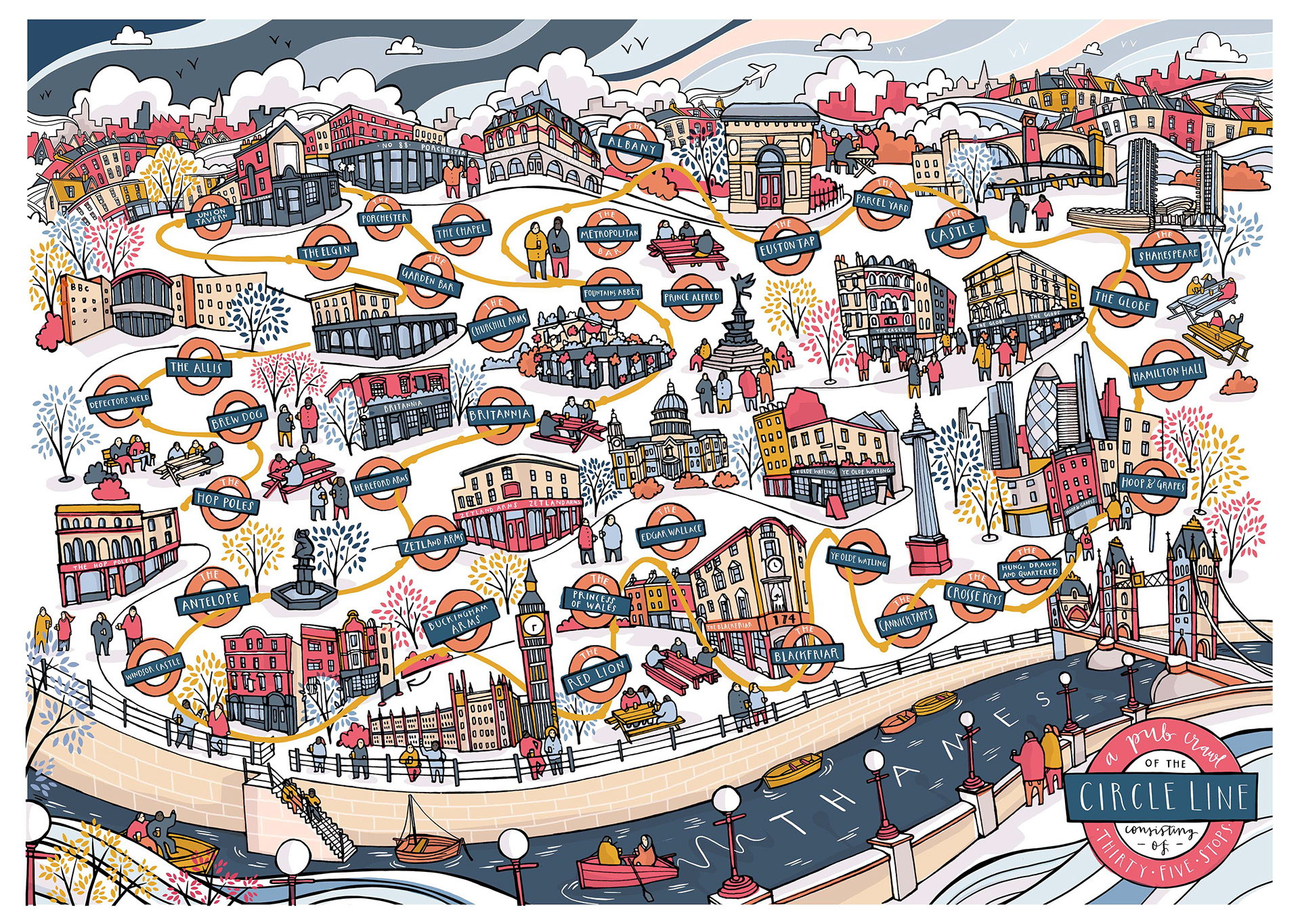 An illustrated map of the Circle Line pub crawl, consisting of 35 stops - for 'Londonist Drinks', an illustrated book of London's drinking scene, published October 2019.