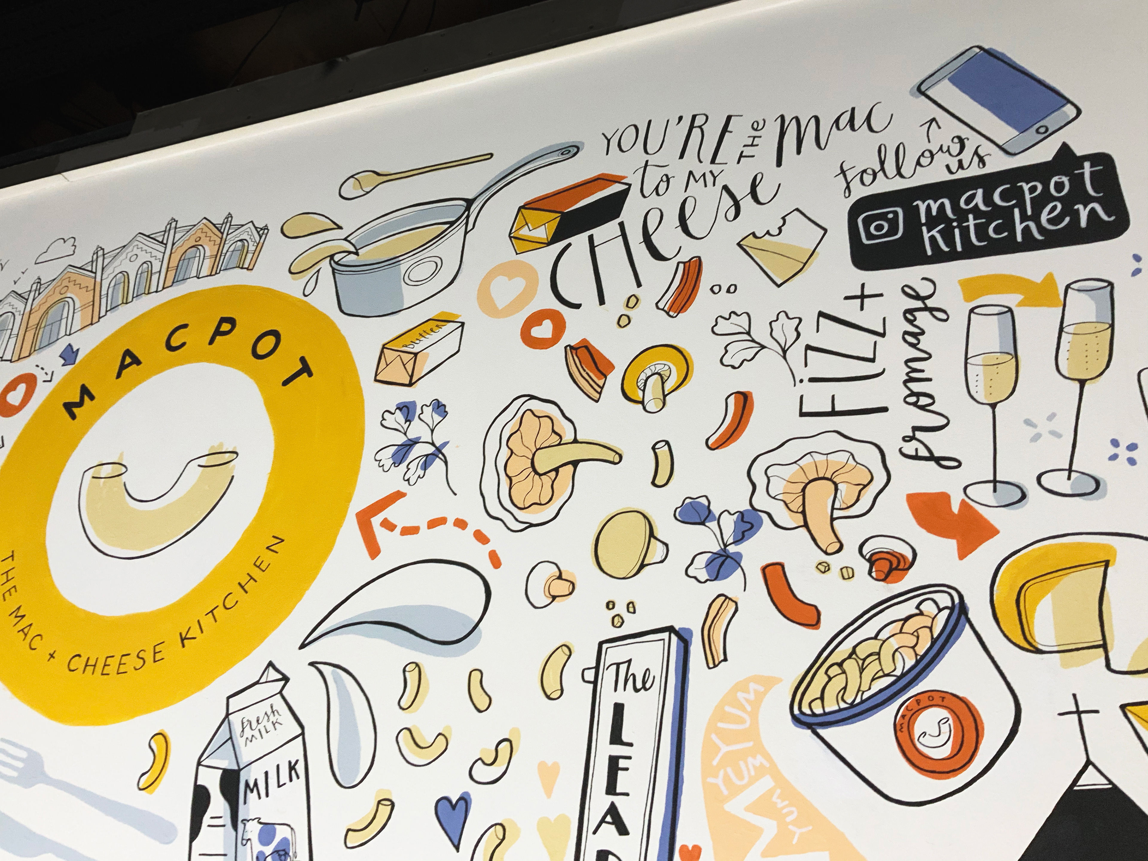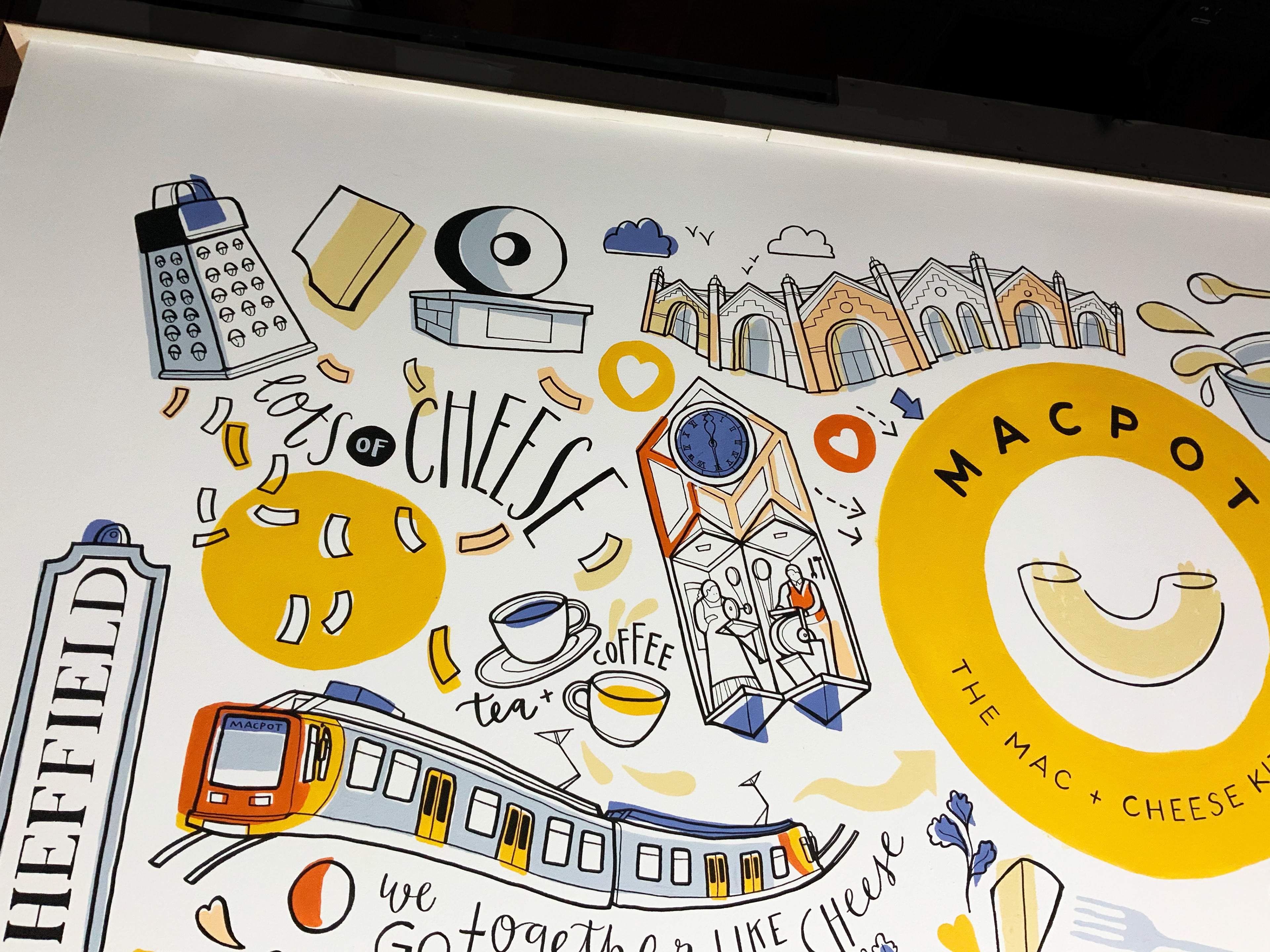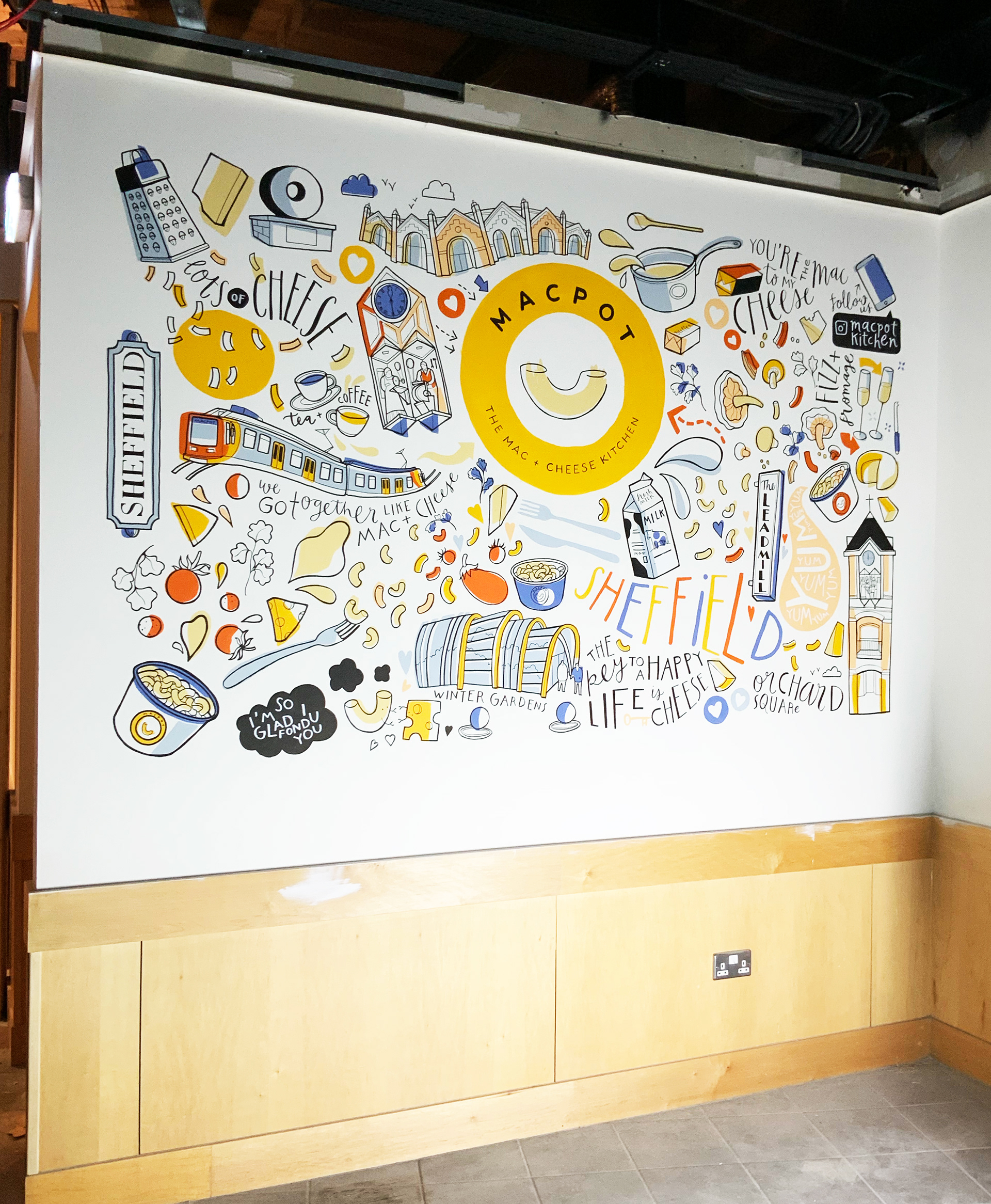 On site mural for Macpot, a mac & cheese kitchen & canteen opened in Sheffield