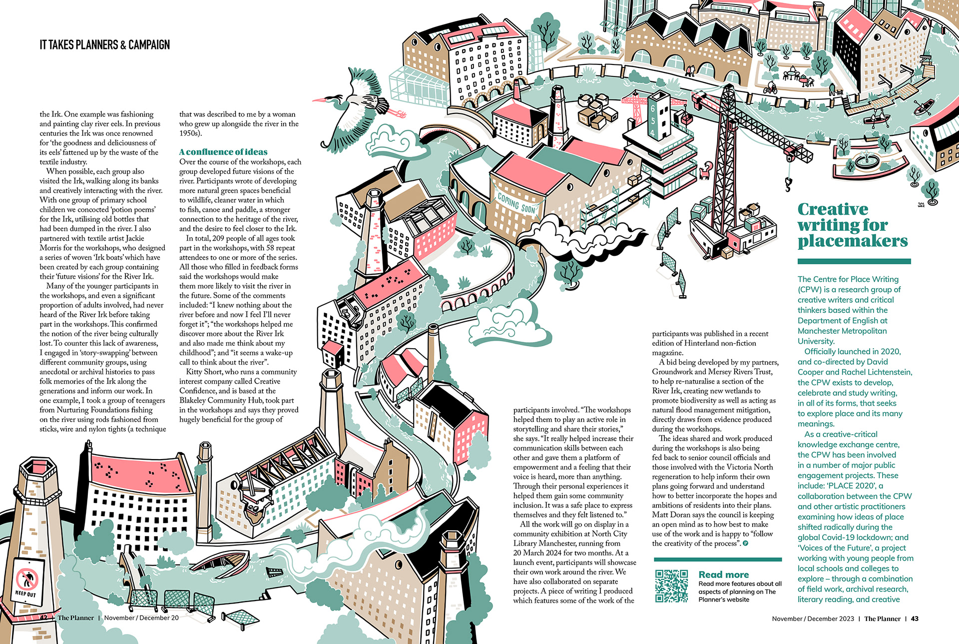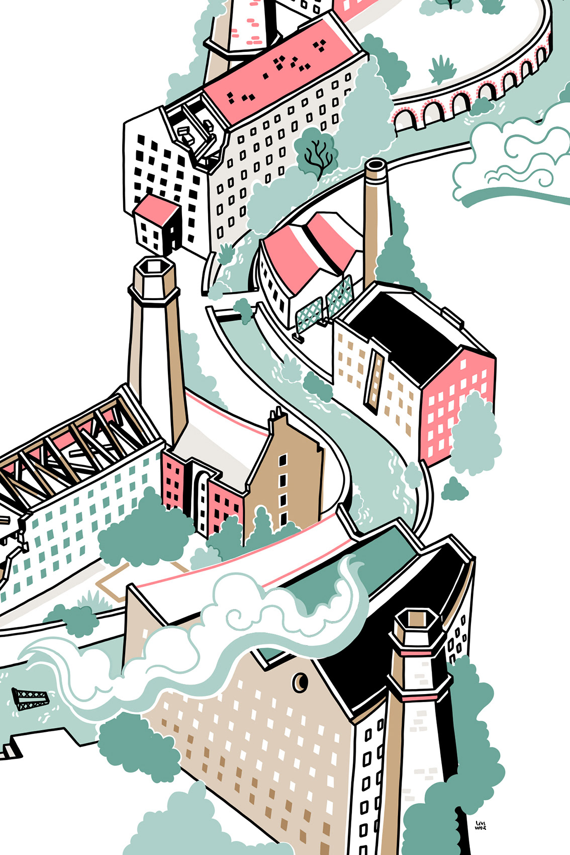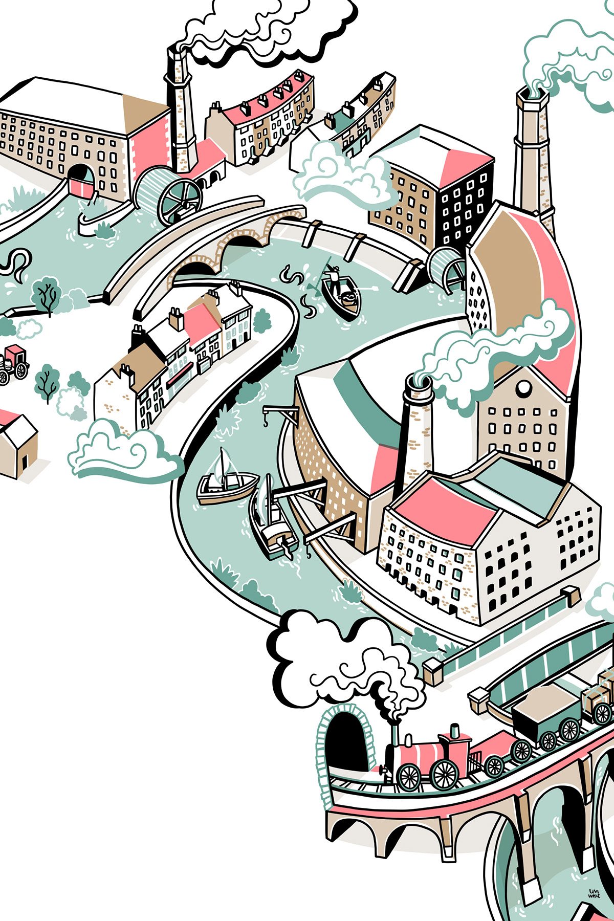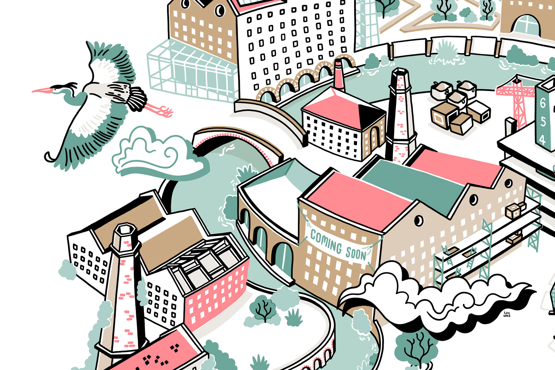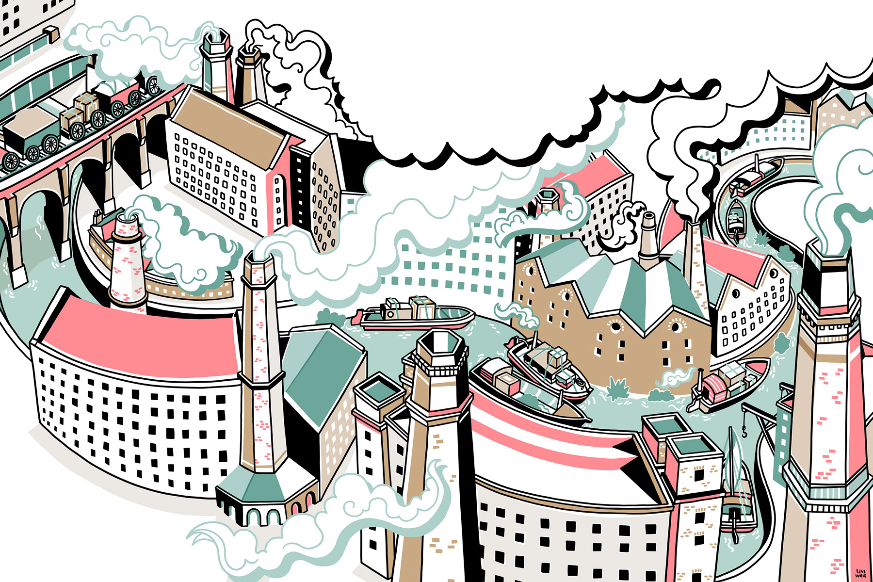 Editorial illustration for The Planner Magazine about the decline of industry and rise of regeneration on the River Irk in Northern England's city of Manchester