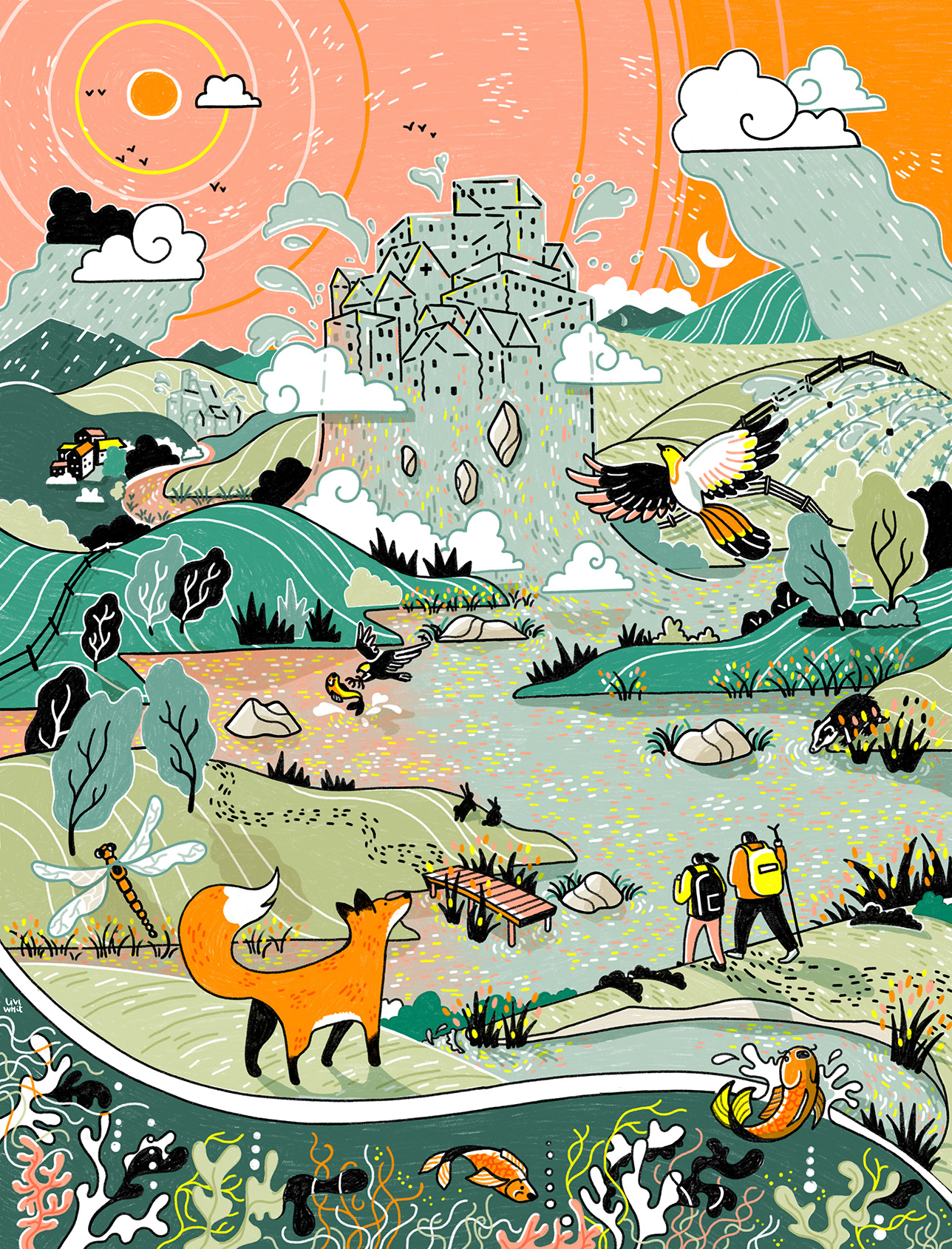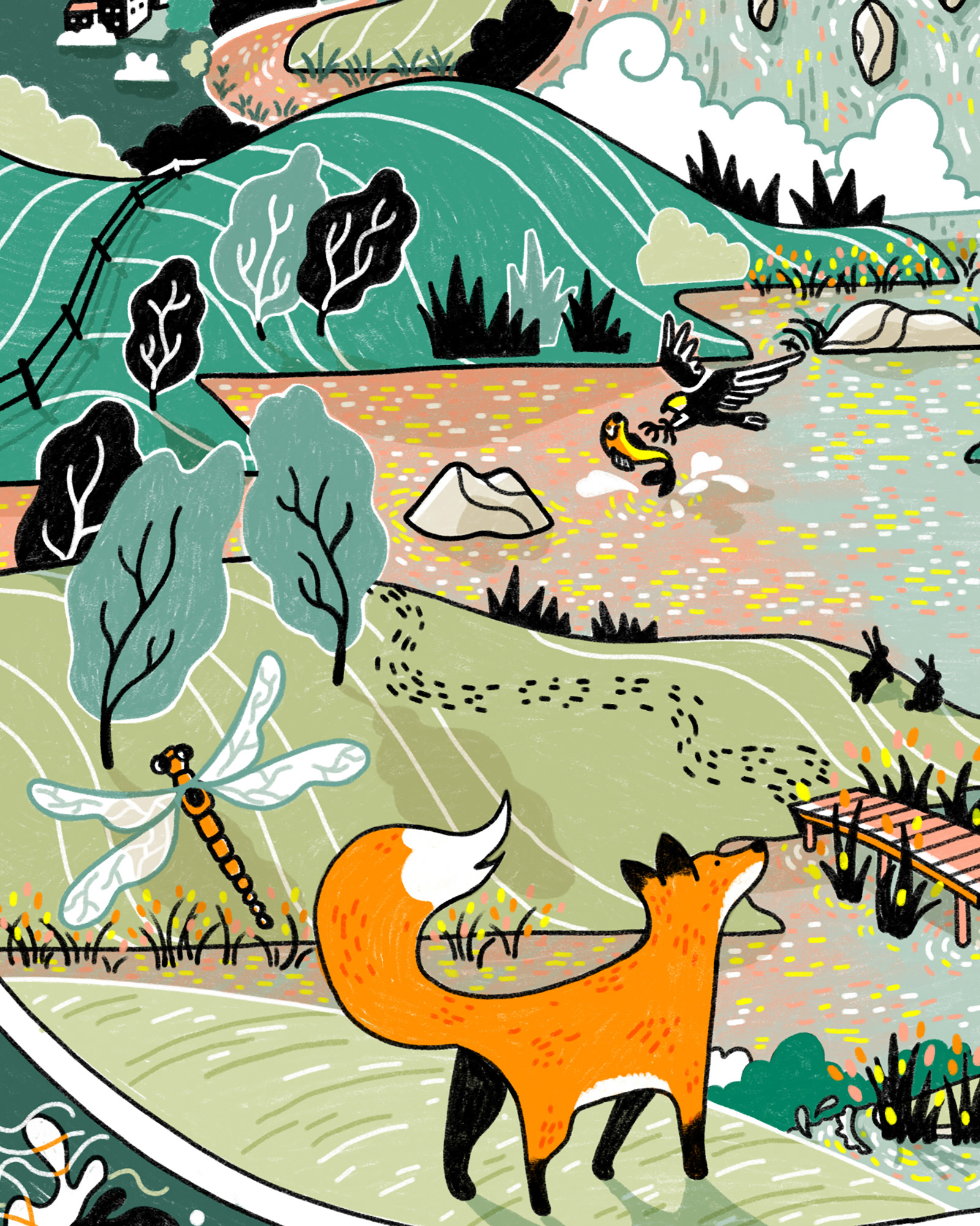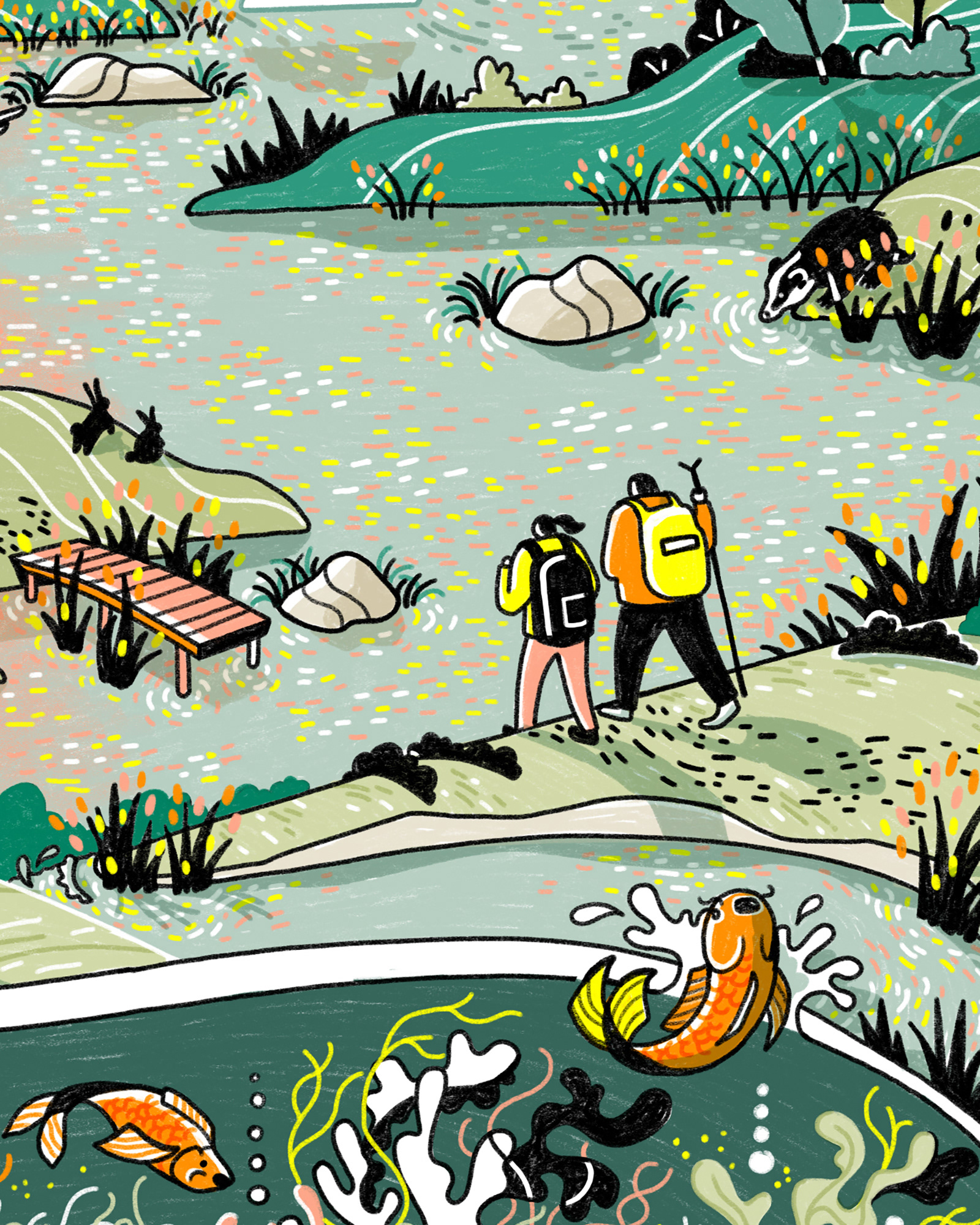 Full-page illustration for The Planner magazine, accompanying a feature on water infrastructure. The piece explored the need for new reservoirs to meet urban demand, while also highlighting their potential to support new biodiversity habitats.