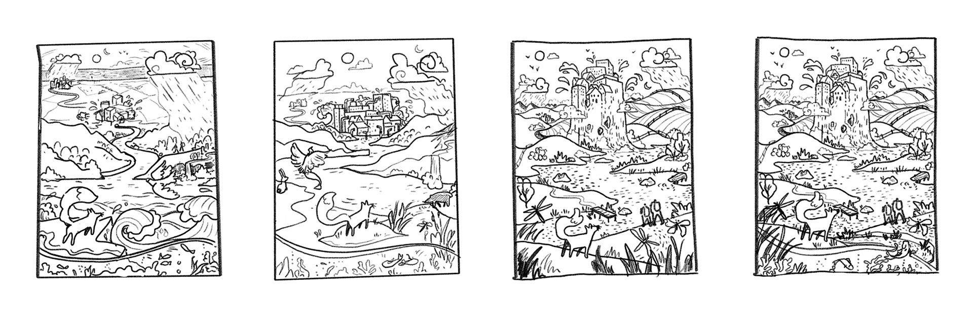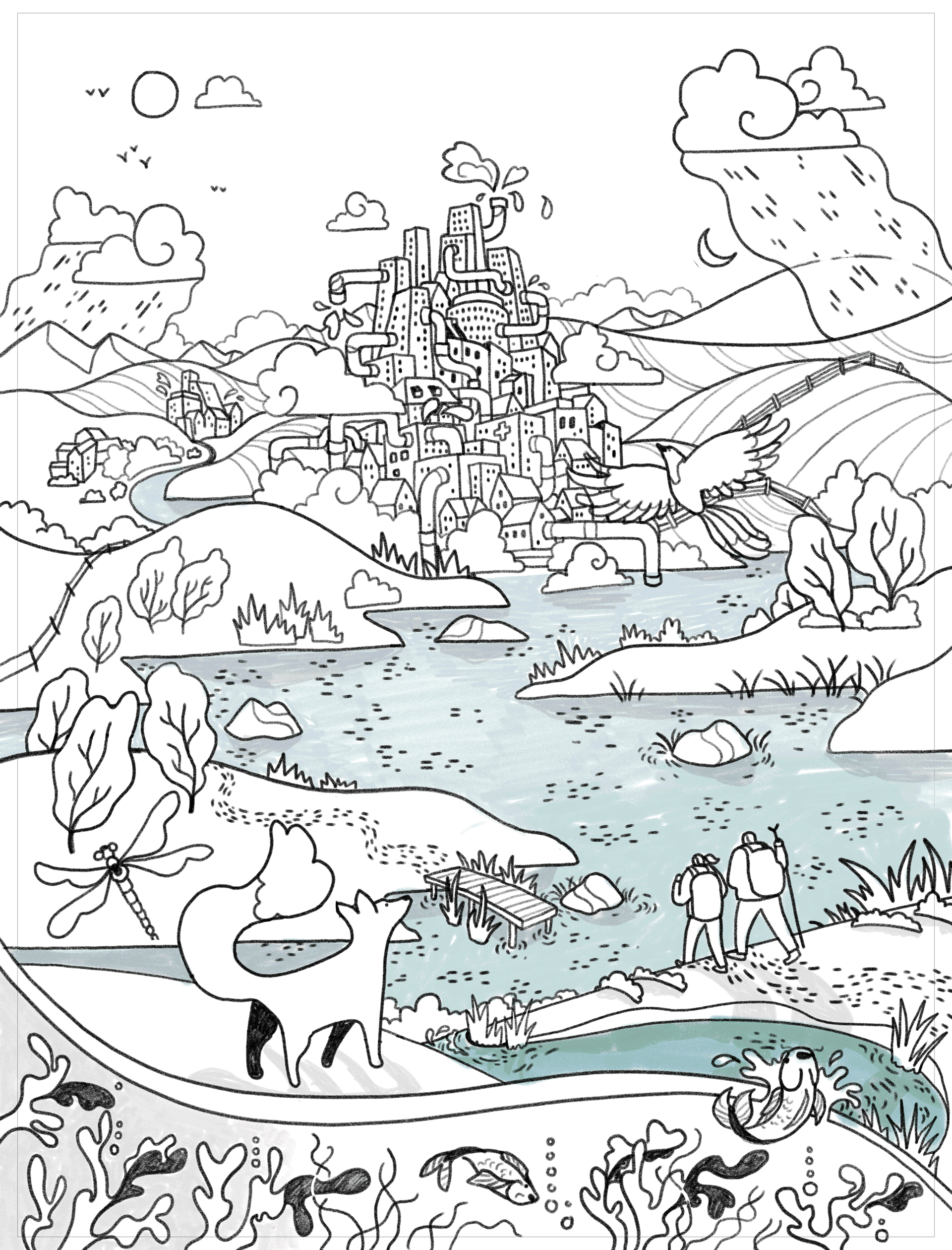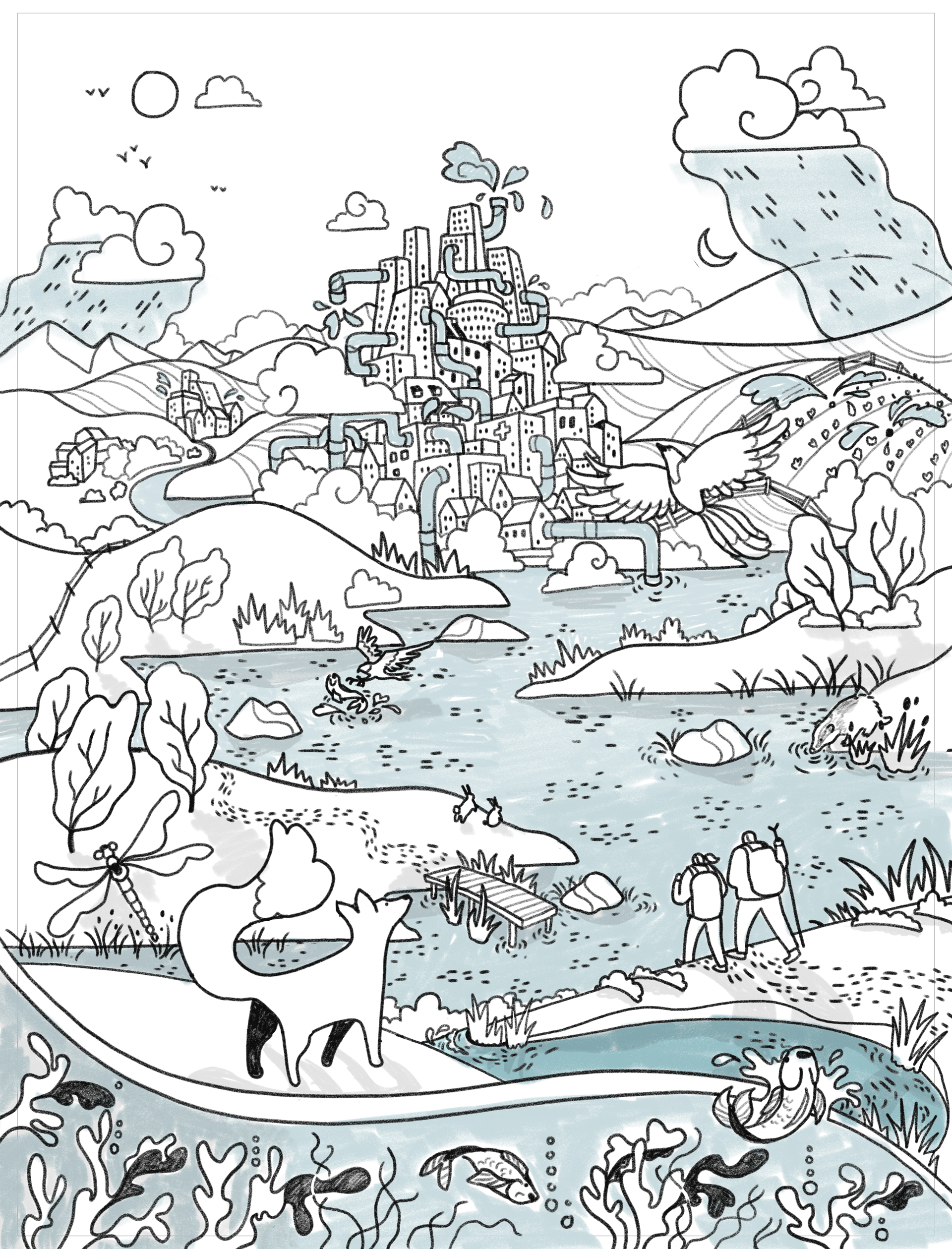 Two rough versions showed a city flowing up from the water, and the other a city sitting on the shoreline woven with pipework and water infrastructure.