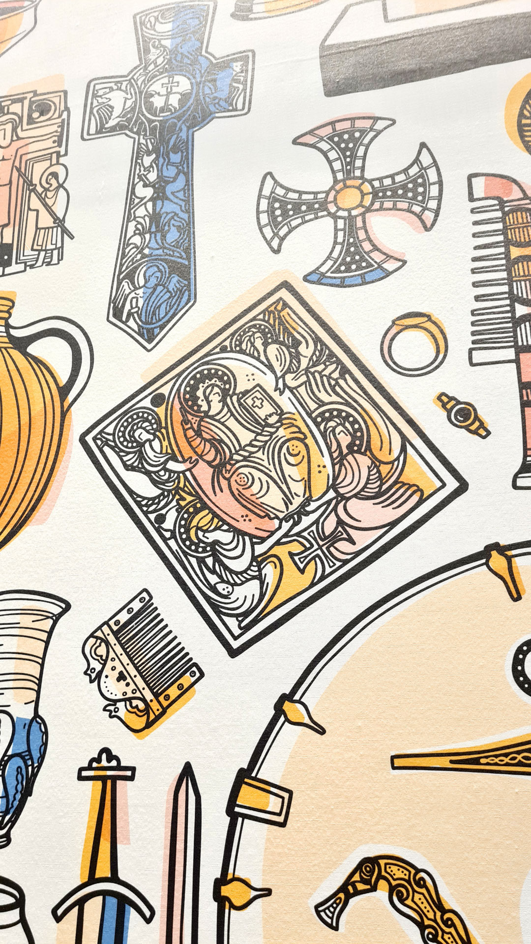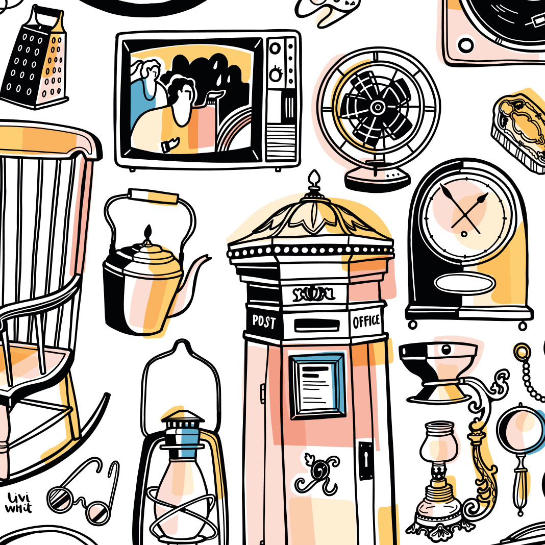 Large mural illustration and various spots for exhibition space showcasing a piece of the old Roman city wall around London, found in the seventies near Aldgate East. The mural, nicknamed the Wall of Antiquities, is a chronological visual 'dig' of artefacts and items through history, starting with Roman London at the bottom and ascending through history towards the modern day. Items are based on found objects on site and artefacts from the Museum of London.