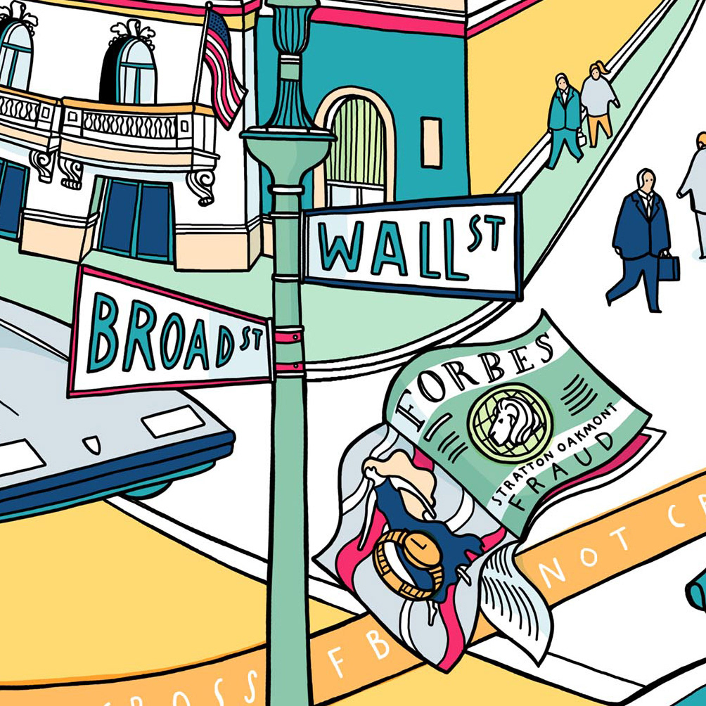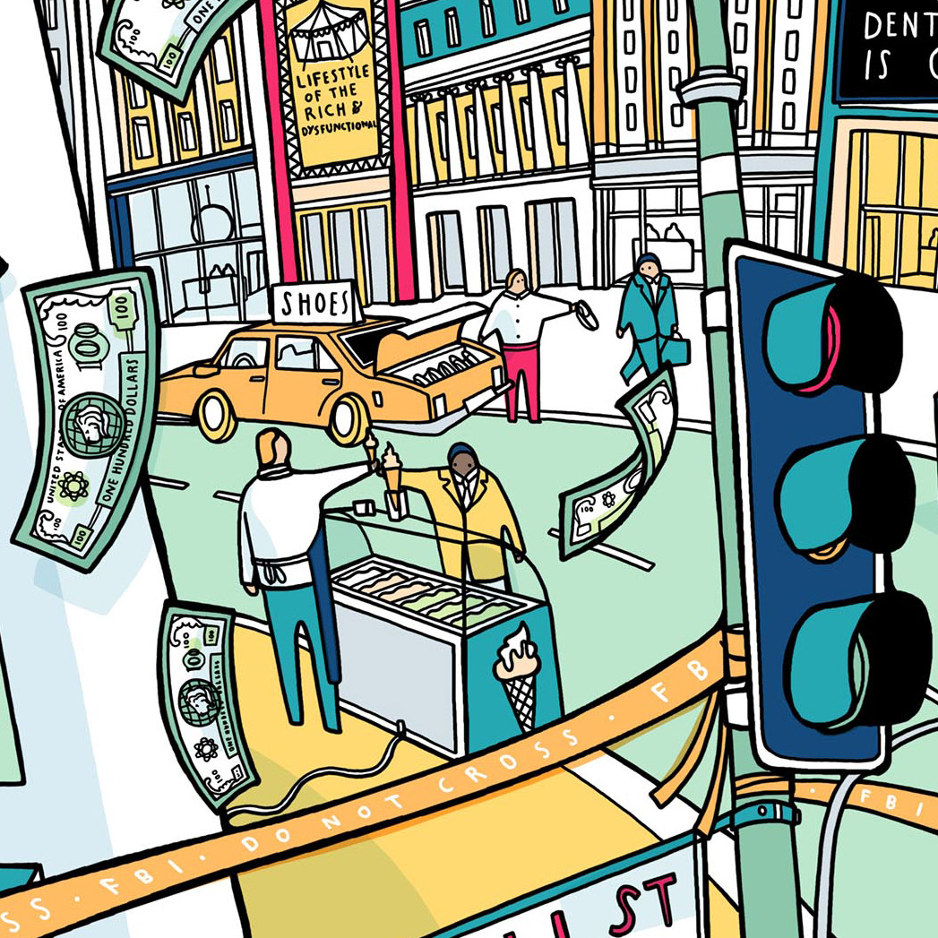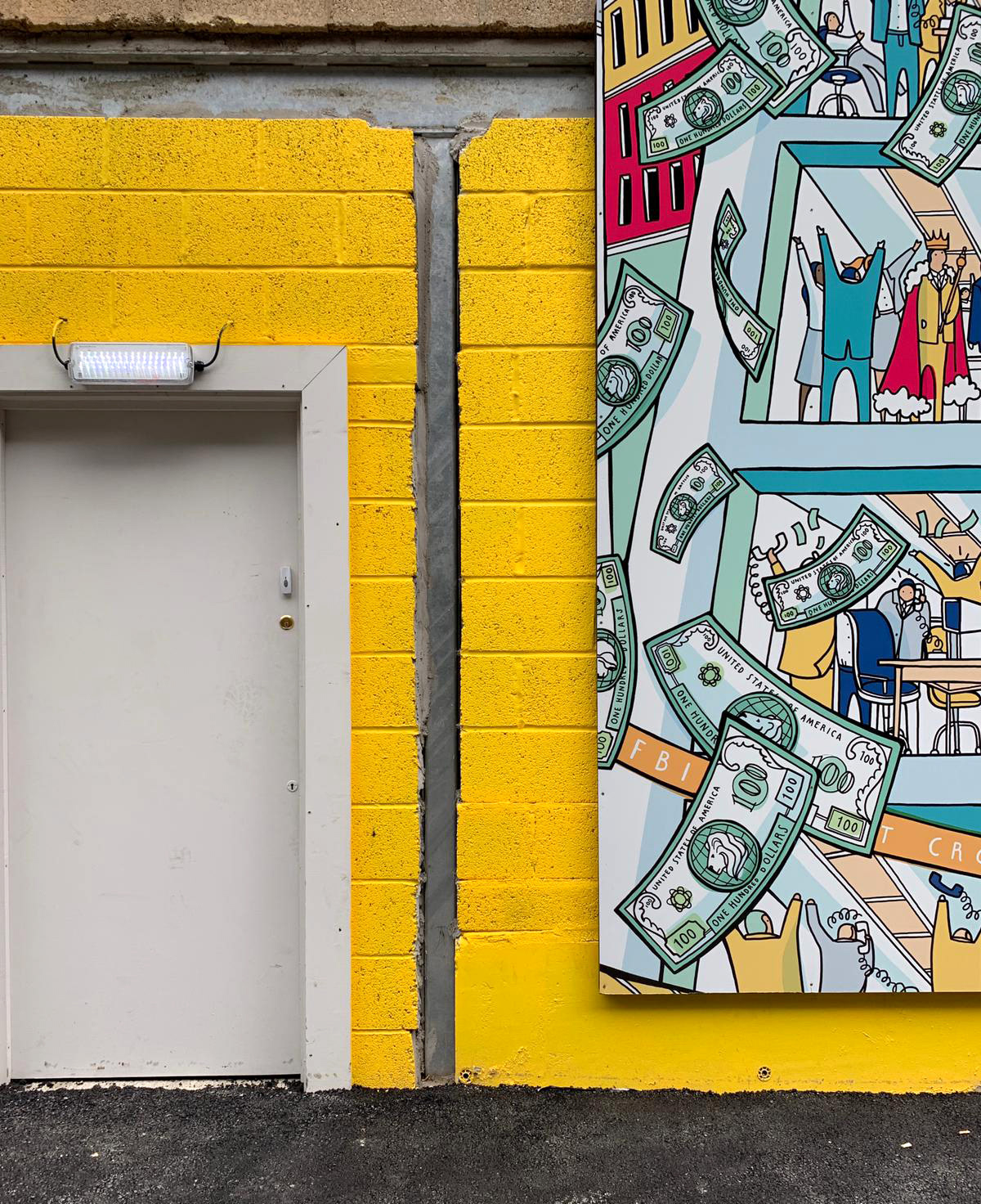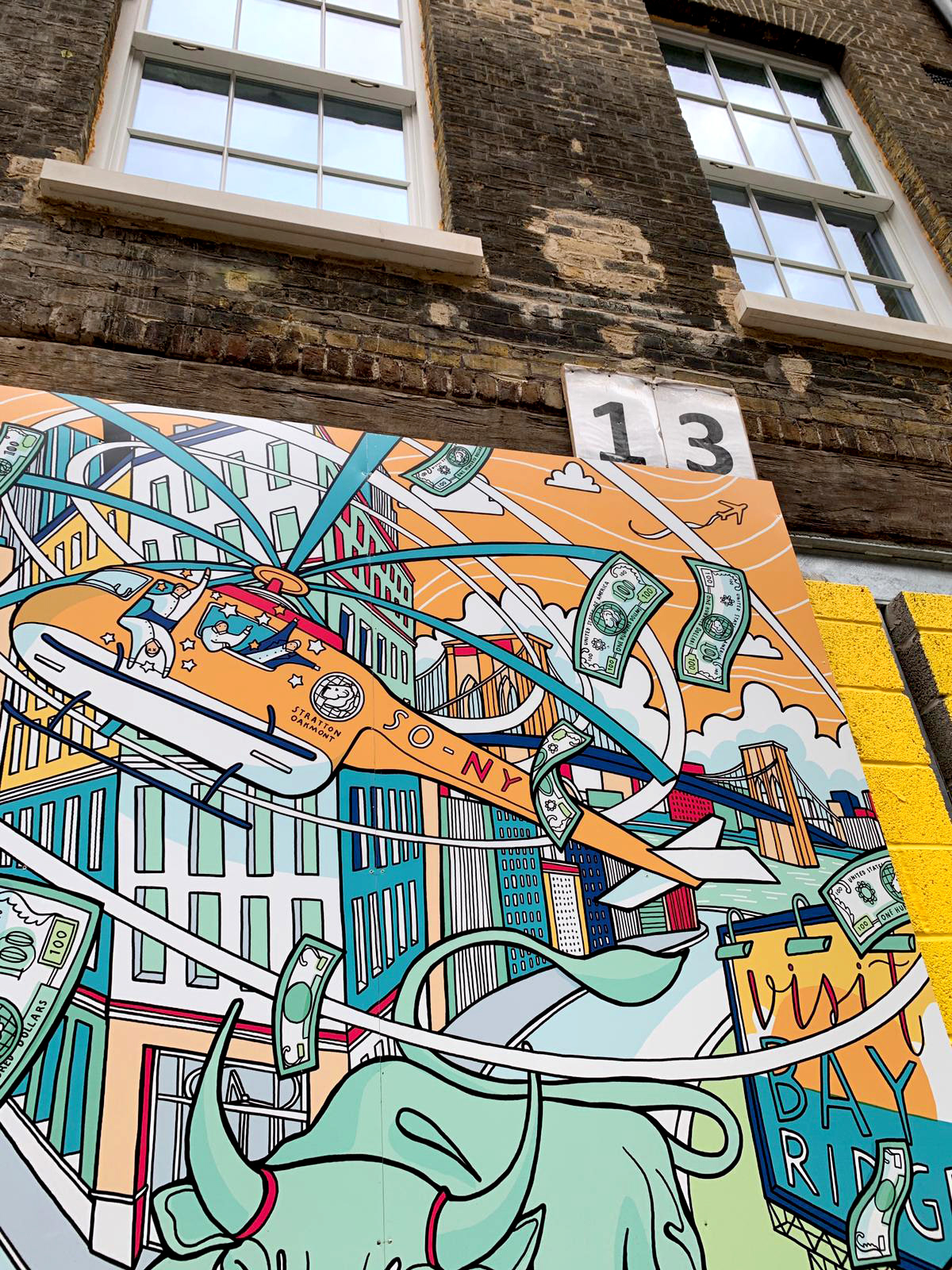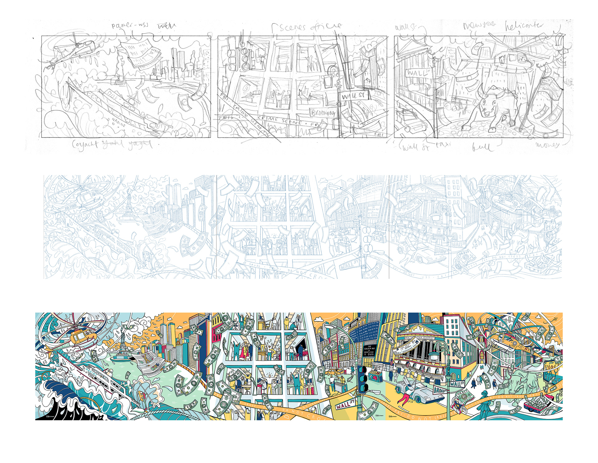 Triptych for the Wolf of Wall Street immersive theatre experience - a series of 3 5x3m panels outside the venue filled with scenes from the story.