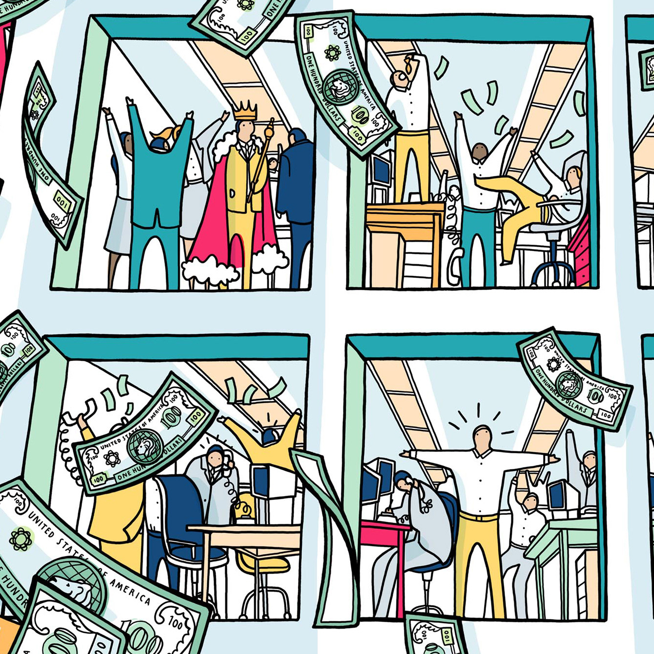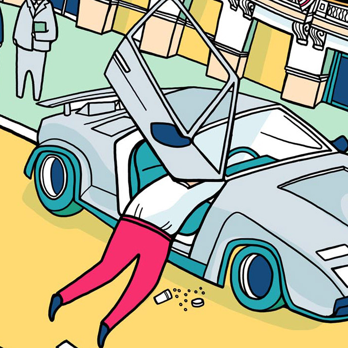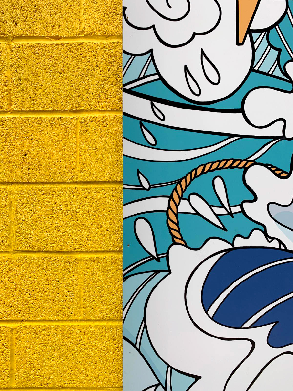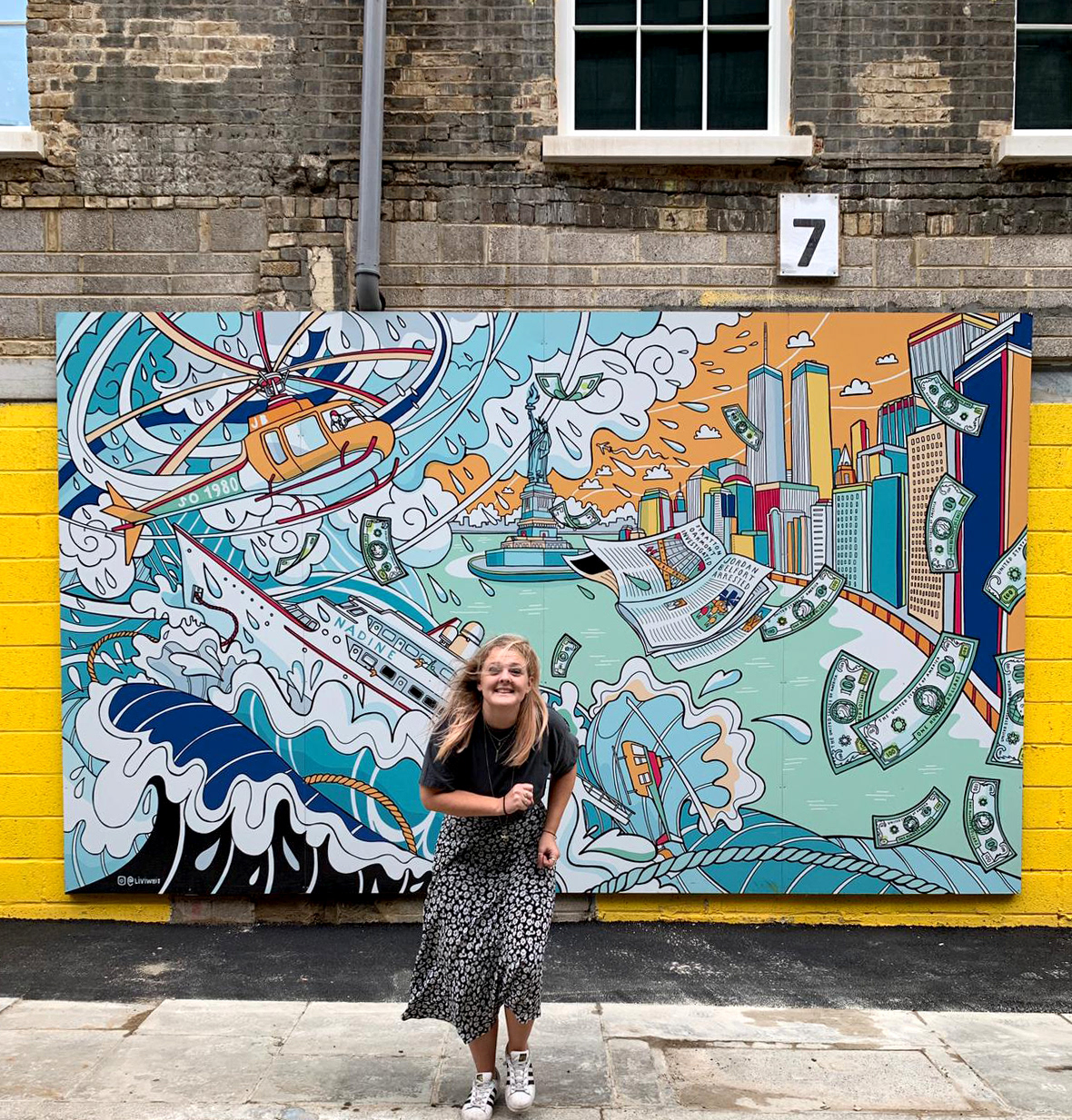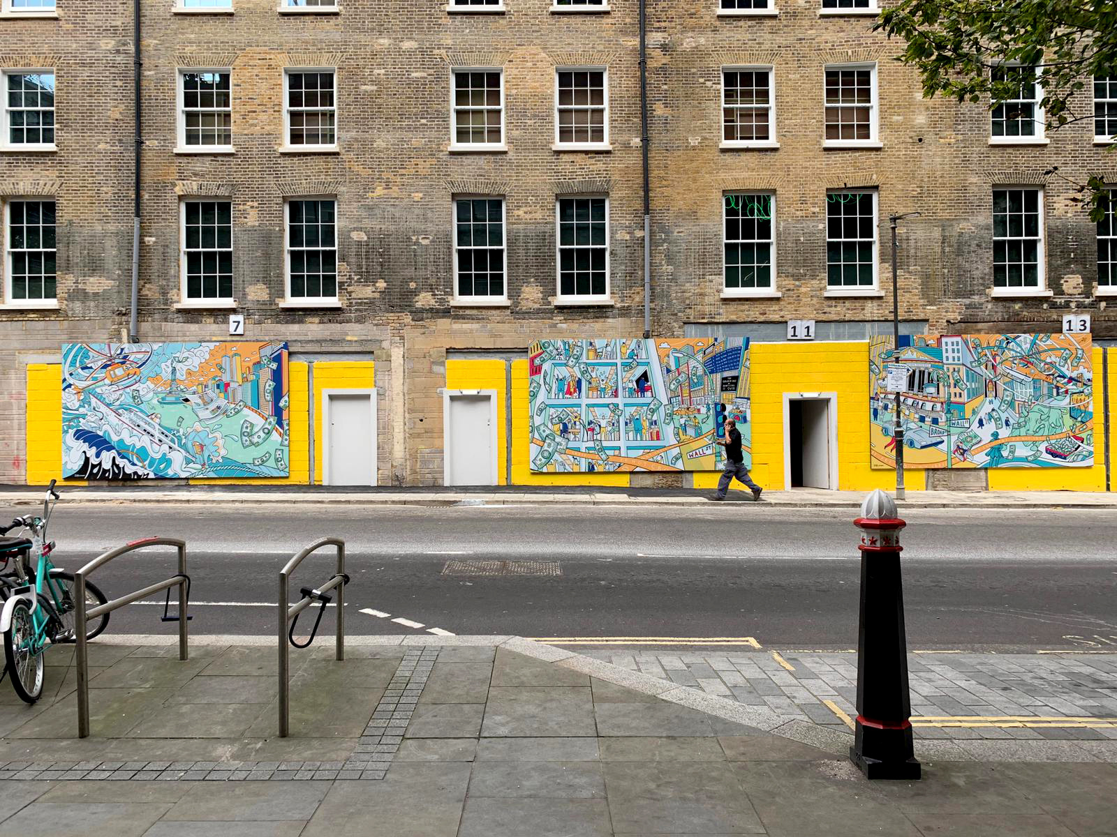 Triptych for the Wolf of Wall Street immersive theatre experience - a series of 3 5x3m panels outside the venue filled with scenes from the story.