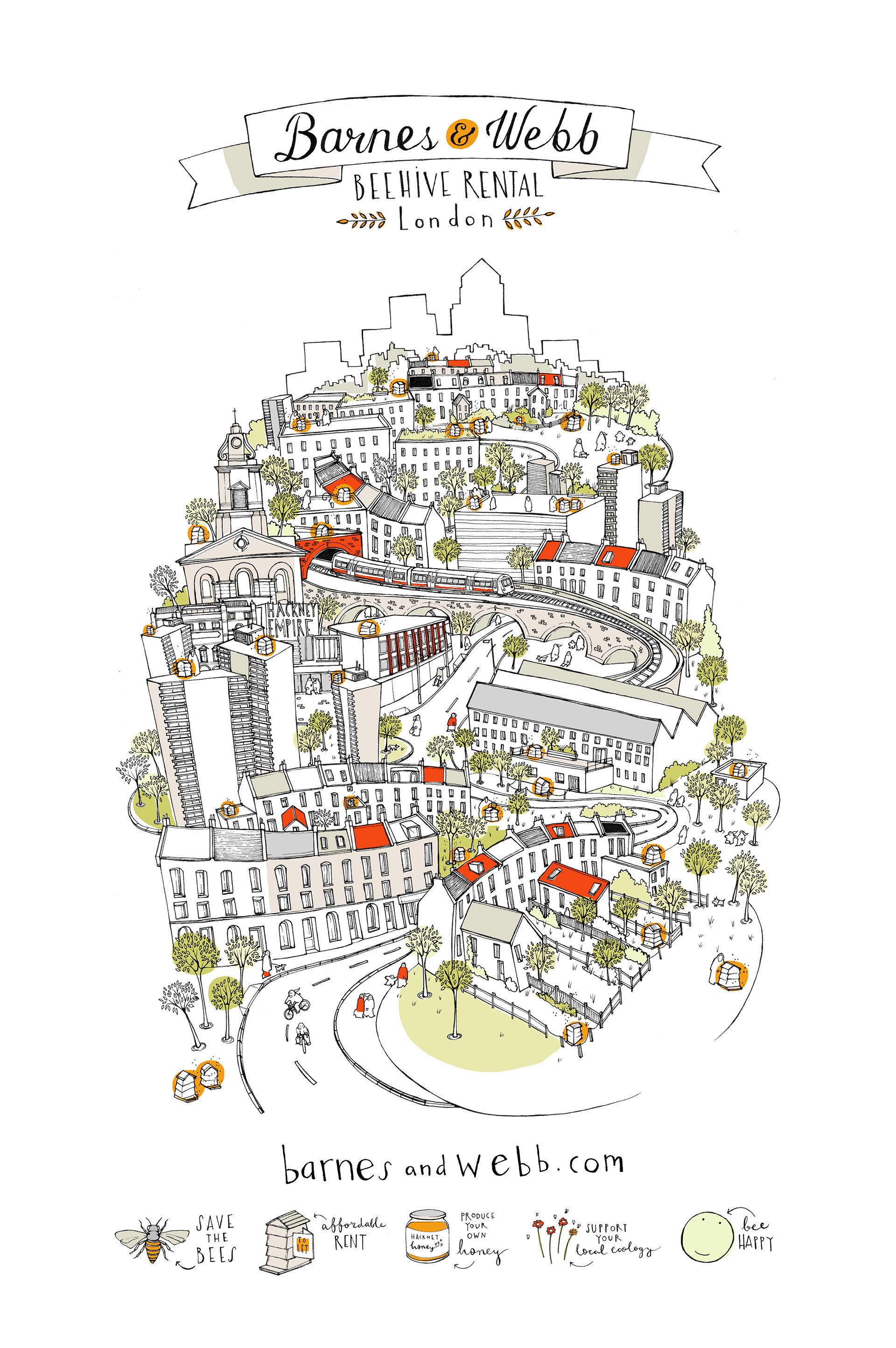As part of the Your Ad Here project, my design was picked, amongst others, to be displayed on a billboard in the Olympic Park. I chose to create an advert for Barnes & Webb, a local beehive hire company based in East London.